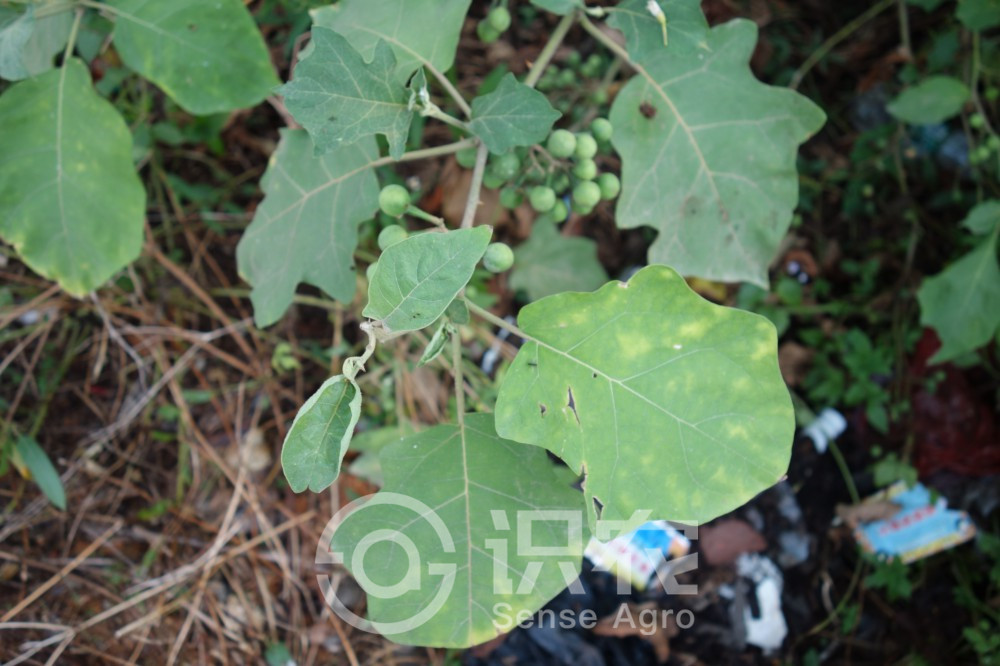 高1-2-(3)米,小枝,葉下面,葉柄及花序柄均被具長柄,短柄或無柄稍不等長5-9分枝的塵土色星狀毛。小枝疏具基部寬扁的皮刺,皮刺淡黃色,基部疏被星狀毛,長2.5-10毫米,寬2-10毫米,尖端略彎曲。葉單生或雙生,卵形至橢圓形,長6-12-(19)厘米,寬4-9-(13)厘米,先端尖,基部心臟形或楔形,兩邊不相等,邊緣半裂或作波狀,裂片通常5-7,上面綠色,毛被較下面薄,分枝少(5-7)的無柄的星狀毛較多,分枝多的有柄的星狀毛較少,下面灰綠,密被分枝多而具柄的星狀毛;中脈在下面少刺或無刺,側脈每邊3-5條,有刺或無刺。葉柄長約2-4厘米,具1-2枚皮刺或不具。傘房花序腋外生,2-3歧,毛被厚,總花梗長1-1.5厘米,具1細直刺或無,花梗長約5-10毫米,被腺毛及星狀毛;花白色;萼杯狀,長約4毫米,外面被星狀毛及腺毛,端5裂,裂片卵狀長圓形,長約2毫米,先端驟尖;花冠輻形,直徑約1.5厘米,筒部隱于萼內,長約1.5毫米,冠檐長約1.5厘米,端5裂,裂片卵狀披針形,先端漸尖,長0.8-1厘米,外面被星狀毛;花絲長約1毫米,花藥長了毫米,為花絲長度的4-7倍,頂孔向上;子房卵形,光滑,不孕花的花柱短于花藥,能孕花的花柱較長于花藥;柱頭截形;漿果黃色,光滑無毛,圓球形,直徑約1-1.5厘米,宿萼外面被稀疏的星狀毛,果柄長約1.5厘米,上部膨大;種子盤狀,直徑約1.5-2毫米。全年均開花結果。
