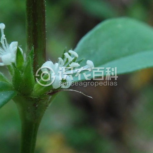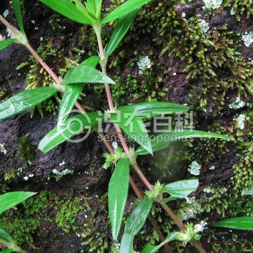 高25-30厘米;枝常平臥,上部方柱形,下部近圓柱形,密被或疏被短硬毛。葉對生,具短柄或無柄,紙質(zhì)或薄革質(zhì),橢圓形或披針形,長2.5-5厘米,寬6-20毫米,頂端短尖或漸尖,基部楔形或鈍,兩面均被短硬毛,觸之刺手,干后邊緣反卷;無側(cè)脈,僅具中脈1條,中脈在上面壓入;托葉略被毛,基部與葉柄合生成鞘,頂部分裂成數(shù)條刺毛,刺毛長3-4毫米。團傘花序腋生,無總花梗,有披針形、長3-4毫米的苞片;花無花梗;萼管倒圓錐形,長約1毫米,被硬毛,萼檐裂片4,披針形,長1-1.5毫米;花冠白色,近漏斗形,除花冠裂片頂端有髯毛外無毛,長3.8-4毫米,冠管長約2毫米,頂部4裂,裂片披針形,長1.8-2毫米;雄蕊生于冠管喉部,花絲長約2毫米,花藥伸出,長圓形,兩端鈍,長僅1毫米;花柱長4-4.5毫米,頂端膨大,頭狀,粗糙。蒴果卵形,長1.5-2.5毫米,直徑1.5-2毫米,被硬毛,成熟時僅頂部開裂,冠以長1.5-2.5毫米的宿存萼檐裂片;種子每室多數(shù),具棱,干時淺褐色。花期3-11月。