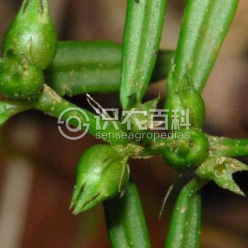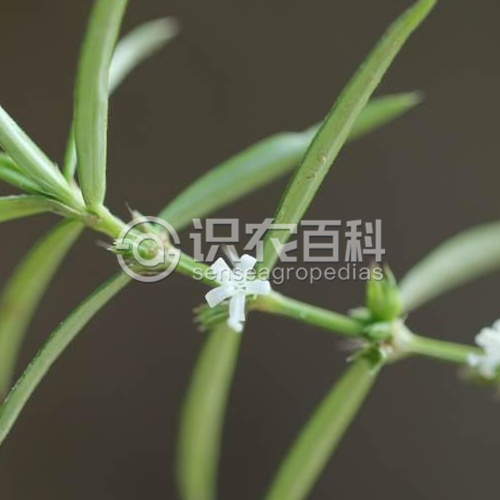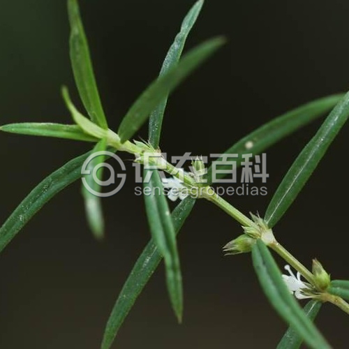 高15-40厘米,全株無毛;枝的上部方柱形,有4銳棱,下部圓柱形。葉對生,無柄,薄革質,線形或線狀披針形,長2-5厘米,寬2-4毫米,頂端短尖或漸尖,基部楔形,微下延,邊緣干后反卷,上面變黑色,密被圓形、透明的小鱗片,下面光滑,顏色較淡;中脈在上面壓入,側脈不明顯;托葉長3-6毫米,基部合生,略被毛,頂部撕裂,裂片剛毛狀。花無梗,1-3朵簇生于葉腋內,有針形、長約1毫米、邊緣有小齒的苞片;萼管倒卵狀,長約1毫米,萼檐裂片4,線狀披針形,長約1.8毫米,具緣毛;花冠白色,漏斗形,長3-3.5毫米,冠管長約2毫米,裂片長圓形,長1-1.5毫米,頂端鈍;雄蕊著生于冠管喉部,花絲長約1.5毫米,花藥伸出,長圓形,兩端鈍,比花絲略短;花柱長約4毫米,柱頭2裂,裂片極短。蒴果卵形或近球形,長2-2.5毫米,直徑1.5-2毫米,宿存萼檐裂片僅長1毫米,成熟時僅頂部開裂;種子每室多數,微小。花期4-11月。