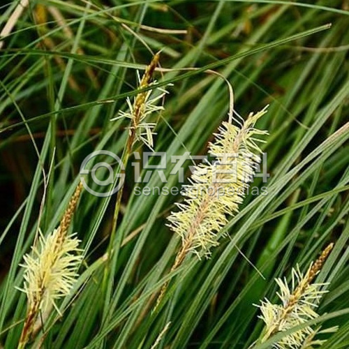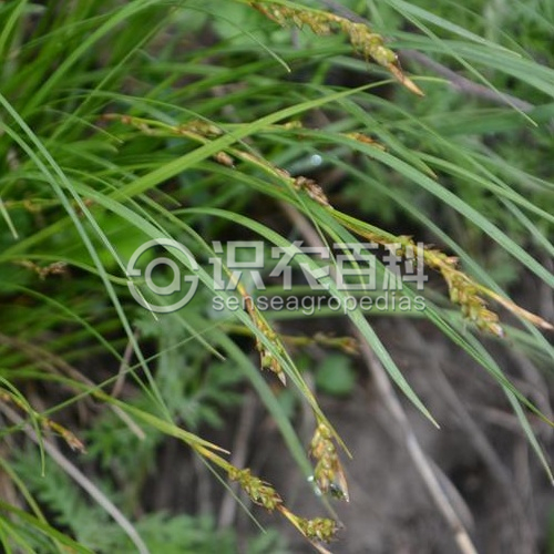 根狀莖粗壯,斜生。稈密叢生,高10-35厘米,纖細,粗約1.5毫米,扁三棱形,上部稍粗糙。葉初時短于稈,后漸延伸,與稈近等長或超出,平張,寬1-2.5毫米,質軟,邊緣稍粗糙,基部具紫褐色分裂呈纖維狀的宿存葉鞘。苞片佛焰苞狀,苞鞘背部淡褐色,其余綠色具淡褐色線紋,腹面及鞘口邊緣白色膜質,下部的在頂端具剛毛狀的短苞葉,上部的呈突尖狀。小穗3一石個,彼此疏遠;頂生的1個雄性,線狀圓柱形,長5-15毫米,粗1.5-2毫米,低于其下的雌小穗或與之等高;側生的2-5個小穗雌性,長圓形或長圓狀圓柱形,長1-1.7厘米,粗2.5-3毫米,有5-10余朵疏生或稍密生的花;小穗柄通常不伸出苞鞘外,僅下部的1個稍外露;小穗軸微呈之字形曲折。雄花鱗片長圓狀披針形,長8-8.5毫米,頂端急尖,膜質,褐色或褐棕色,具寬的白色膜質邊緣,有1條中脈;雌花鱗片披針形或倒卵狀披針形,長5-6毫米,頂端急尖或漸尖,具短尖,紙質,兩側紫褐色,有寬的白色膜質邊緣,中間淡綠色,有3條脈。果囊明顯短于鱗片,倒卵狀長圓形,鈍三棱形,長約3毫米,紙質,淡綠色,密被短柔毛,具2側脈及若干隆起的細脈,基部驟縮成長柄,頂端圓,具短喙,喙口截形。小堅果倒卵狀橢圓形,三棱形,長2.5-2.8毫米,基部具短柄,頂端具外彎的短喙;花柱基部稍增粗,柱頭3個。