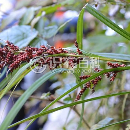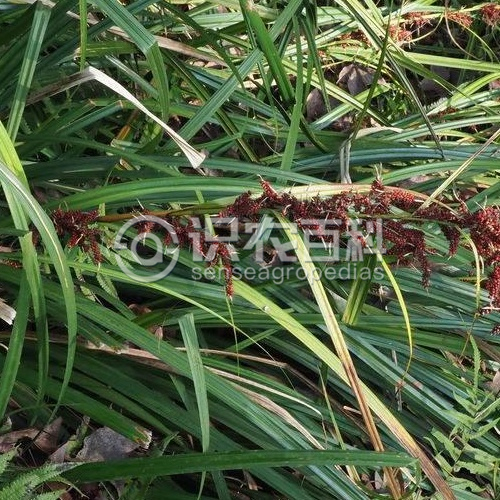 根狀莖木質(zhì)。稈密叢生,直立而粗壯,高80-150厘米,粗5-6毫米,三棱形,無毛,中部以下生葉。葉基生和稈生,長于稈,平張,寬8-12毫米,下面光滑,上面粗糙,基部具紅褐色、分裂成網(wǎng)狀的宿存葉鞘。苞片葉狀,長于花序,基部具長鞘。圓錐花序復(fù)出,長10-35厘米;支圓錐花序3-8個,單生,輪廓為長圓形,長5-6厘米,寬3-4厘米,下部的1-3個疏遠,其余的甚接近。小苞片鱗片狀,披針形,長3.5-4毫米,革質(zhì),僅基部1個具短鞘,其余無鞘,頂端具芒;支花序柄堅挺,基部的1個長12-14厘米,上部的漸短,通常不伸出苞鞘之外;花序軸鈍三棱柱形,幾無毛;小穗多數(shù),全部從內(nèi)無花的囊狀枝先出葉中生出,圓柱形,長3-6厘米,兩性,雄雌順序;雄花部分纖細,具少數(shù)花,長為雌花部分的1/2或1/3;雌花部分具多數(shù)密生的花。雄花鱗片寬卵形,長2-2.5毫米,頂端具芒,膜質(zhì),栗褐色;雌花鱗片寬卵形,長2-2.5毫米,頂端具長芒,紙質(zhì),紫褐色或栗褐色,僅具1條綠色的中脈,邊緣白色膜質(zhì)。果囊倒卵狀球形或近球形,腫脹,長3.5-4.5毫米,近革質(zhì),成熟時鮮紅色或紫紅色,有光澤,具多數(shù)縱脈,上部邊緣與喙的兩側(cè)被短粗毛,基部具短柄,頂端驟縮呈短喙,喙口具2小齒。小堅果橢圓形,三棱形,長3-3.5毫米,成熟時褐色,基部具短柄,頂端具短尖;花柱基部不增粗,柱頭3個。花果期8-12月。