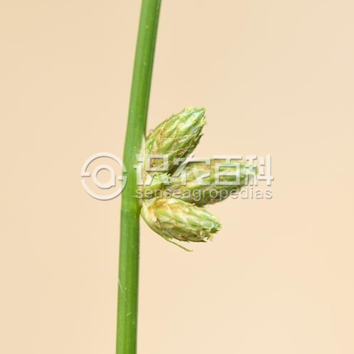 叢生,無根狀莖。稈細弱,高10-40厘米,平滑,基部具2-3個鞘,鞘管狀,近于膜質,長3-9厘米,上端開口處為斜截形,口部邊緣干膜質,頂端鈍圓或具短尖。葉缺如。苞片1枚,為稈的延長,直立,頂端急尖,長4.5-13厘米,基部稍擴大;小穗單生或2-3個成簇,假側生,長圓狀卵形,頂端急尖,長7-17毫米,寬3-6毫米,淡綠色或淡棕緣色,具10多朵至多數花;鱗片長圓狀卵形,頂端漸尖,近于革質,長4-5.5毫米,背面較寬部分為綠色,具一條中脈延伸出頂端呈短尖,兩側淡棕色、淡棕綠色或近于白色半透明,具深棕色短條紋;下位剛毛4條,長于小堅果,上部生有倒刺;雄蕊3,花藥長圓形,藥隔稍突出;花柱中等長,柱頭2。小堅果寬橢圓形,平凸狀,長約2毫米,黑褐色,有不明顯的皺紋,稍具光澤。花果期9-11月。