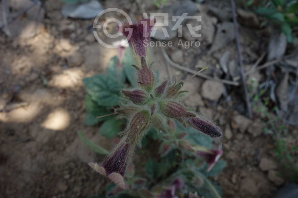 體高10-30厘米,密被灰白色多細胞長柔毛和腺毛。根莖肉質,鮮時黃色,在栽培條件下,直徑可達5.5厘米,莖紫紅色。葉通常在莖基部集成蓮座狀,向上則強烈縮小成苞片,或逐漸縮小而在莖上互生;葉片卵形至長橢圓形,上面綠色,下面略帶紫色或成紫紅色,長2-13厘米,寬1-6厘米,邊緣具不規則圓齒或鈍鋸齒以至牙齒;基部漸狹成柄,葉脈在上面凹陷,下面隆起。花具長0.5-3厘米之梗,梗細弱,彎曲而后上升,在莖頂部略排列成總狀花序,或幾全部單生葉腋而分散在莖上;萼長1-1.5厘米,密被多細胞長柔毛和白色長毛,具10條隆起的脈;萼齒5枚,矩圓狀披針形或卵狀披針形抑或多少三角形,長0.5-0.6厘米,寬0.2-0.3厘米,稀前方2枚各又開裂而使萼齒總數達7枚之多;花冠長3-4.5厘米;花冠筒多少弓曲,外面紫紅色,被多細胞長柔毛;花冠裂片,5枚,先端鈍或微凹,內面黃紫色,外面紫紅色,兩面均被多細胞長柔毛,長5-7毫米,寬4-10毫米;雄蕊4枚;藥室矩圓形,長2.5毫米,寬1.5毫米,基部叉開,而使兩藥室常排成一直線,子房幼時2室,老時因隔膜撕裂而成一室,無毛;花柱頂部擴大成2枚片狀柱頭。蒴果卵形至長卵形,長1-1.5厘米。花果期4-7月。