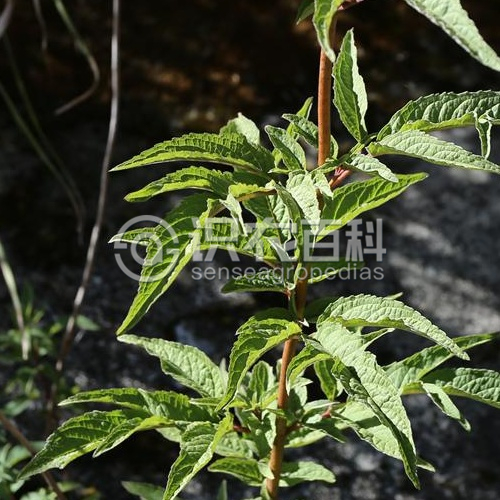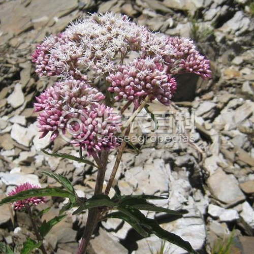 多年生草本,高約2米。莖直立,簇生,分枝斜升,雙叉狀,上部花序分枝傘房狀,纖細;莖枝初時綠色,被稠密銹色短柔毛,后變無毛,灰褐色。葉對生;中部莖葉三深裂,中裂片大,披針形,長10—15厘米,寬2.5—3厘米,基部楔形,頂端漸尖,側生裂片小,披針形;自中部向上或向下的葉漸小;下部莖葉不分裂,卵形或寬卵形;上部莖葉長卵形或卵狀披針形,三深裂或三淺裂,或不分裂;全部葉有葉柄,中部莖葉的柄長l.5—2.5厘米,質地稍厚,上面綠色,被稀疏的短糙毛,下面色淡,有多數黃色腺點及沿脈被較密的貼緊的短柔毛,羽狀脈,側脈5—7對,在葉下面稍高起。頭狀花序多數,在莖頂及枝端排成疏松的傘房花序,花序徑8—11厘米。總苞鐘狀,長5毫米,含5個小花;總苞片3層,覆瓦狀排列;外層總苞片橢圓形,長1一1.5毫米;中層及內層總苞片漸長,長橢圓形,長約5毫米;全部苞片頂端鈍,無毛無腺點。花白色,花冠長3.5毫米。瘦果黑褐色,長2.5毫米,5棱,無毛無腺點;冠毛污白色,長3毫米。