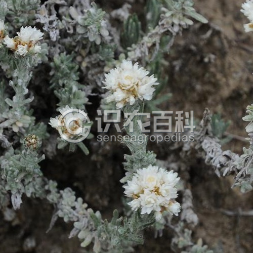 根狀莖木質,有單生或叢生的根出條及花莖,莖直立或斜升,高15-80厘米,稍細,下部木質,多分枝,被白色密棉毛,下部有時脫毛或有被棉毛的腋芽,全部有密集的葉。下部葉在花期枯落,葉開展或平展,線形,長1.5-6厘米,寬0.5-0.4厘米,向莖中或上部漸大,基部常寬大而有抱莖的小耳,頂端漸尖,有細尖頭,邊緣反卷;頂部葉較細短;全部葉上面被蛛絲狀毛或無毛,下面被白色密棉毛;中脈在下面稍凸起,側脈不顯明。根出條有長圓形披針形或倒披針形的葉,被較長的棉毛。頭狀花序極多數,無?;蛴虚L達3毫米的花序梗,在莖和枝端密集成復傘房狀。總苞鐘狀,長5-6毫米,徑4-6毫米;總苞片5-6層,外層淺黃褐色或帶紫紅色,被長棉毛,卵圓形,長2.5毫米,內層倒卵狀長圓形,頂端圓形,長達4毫米,在雌株白色,寬約1.2毫米;在雄株乳白色稀稍紅色寬達1.5毫米;最內層匙形,有長達三分之二的爪部?;ㄍ蟹涓C狀。雌株頭狀花序外圍有多層雌花,中央有1-4個雄花;雄株頭狀花序全部有雄花?;ü陂L2.3-3毫米。冠毛約與花冠等長;雄花冠毛上部較粗厚。瘦果長圓形,具小腺體?;ü?-10月。