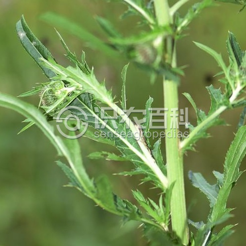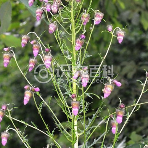 多年生草本,高1-3m。莖直立,粗壯,上部分枝,全部莖枝有條棱,被極稀疏的蛛絲狀及多細胞長節毛,上部花序分枝上的蛛絲毛稍稠密。基生葉及下部莖葉全形長橢圓形、偏斜橢圓形、長倒披針形或橢圓形,下部漸狹成長或短翼柄或無柄,明顯的但卻不規則二回羽狀分裂,一回為深裂,一回側裂片5-7對,半長橢圓形或偏斜披針形,中部側裂片較大,長4-16cm,寬1.5-6cm,向上向下的側裂片漸小,全部一回側裂片僅一側深裂或半裂,而另側不裂,邊緣有針刺狀緣毛或兼有少數小型刺齒,二回側裂片斜三角形,二回頂裂片長披針形或寬線形,全部二回裂片邊緣及頂端有針刺;向上的葉漸小,無柄或擴大耳狀抱莖。全部葉兩面同色,綠色或下面稍淡,無毛,邊緣及齒頂或裂片頂端針刺長可達3mm。頭狀花序下垂,在莖枝頂端排成總狀圓錐花序。總苞鐘狀,直徑3.5-5cm,無毛。總苞片約10層,覆瓦狀排列,外層與中層長三角形至鉆狀披針形,全長1-4cm,寬1-2.5mm,上部或中部以上鉆狀,向外反折或開展,內層及最內層披針形或線狀披針形,長1.2-2,5cm,寬1.5-2mm,頂端短鉆狀漸尖。小花紫色或紅色,花冠長2.2cm,細管部細絲狀,長1.6cm,檐部短,長6mm,5淺裂。瘦果偏斜楔狀倒披針形,頂端斜截形,長4mm,寬2mm,稍壓扁。冠毛污白色,多層,基部連合成環,整體脫落;冠毛長羽毛狀,長達2.2cm,向頂端漸細。花果期6-9月。