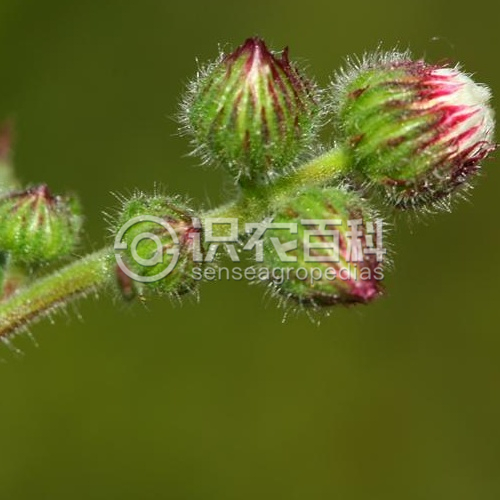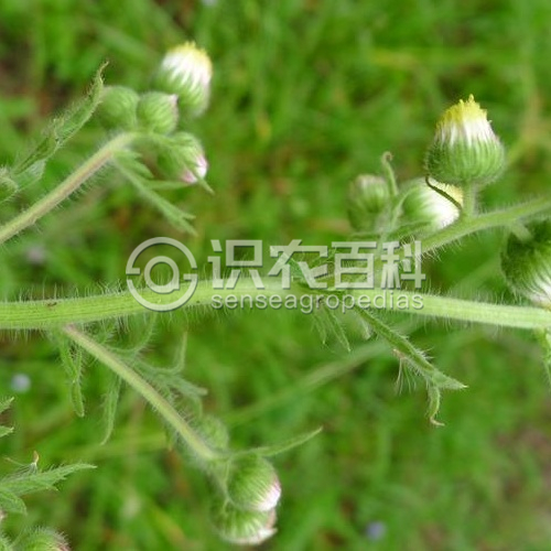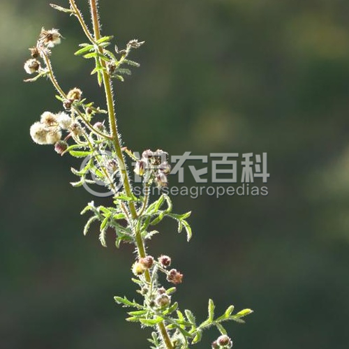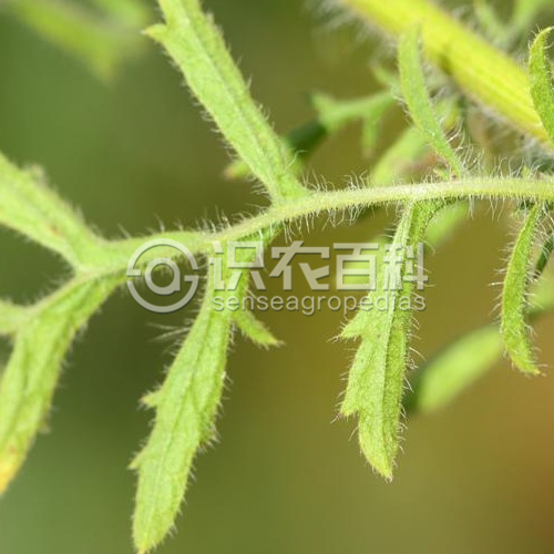 (4)厘米,無柄,基部狹,全部葉羽狀深裂,稀淺裂,裂片通常4-6對,線形或線狀披針形,極偏斜,頂端稍尖,全緣或有疏齒,頂端的裂片大,倒卵狀披針形,具疏齒,葉脈在背面明顯,兩面被長毛和密腺毛。頭狀花序徑7-10毫米,在莖和枝端排成狹而短的圓錐狀花序;花序梗短,密被開展的長毛及腺毛;總苞半球狀鐘形,長約6毫米,寬約10毫米;總苞片3-4層,綠色,線形,頂端漸尖,有白色膜質的邊緣,背面被密長毛和腺毛,外層較短,長約3.5毫米,內層長6-7毫米,長于花盤,頂端常變紅紫色,向外稍反折;花黃色,全部結實,外圍的雌花極多數,花冠絲狀,長2-2.5毫米,上部被疏微毛,長約為花柱的二分之一;中央約有40個兩性花,花冠管狀,長4-4.5毫米,檐部窄鐘狀,有5披針形裂片,管部上端被短微毛;花托半球形,中央明顯凸起,兩性花的窩孔較雌花的大,具齒緣。瘦果長圓形,長約1毫米,扁壓,邊緣脈狀,兩面被微毛;冠毛1層,污白色,糙毛狀,稍長于花冠,基部連合成環。