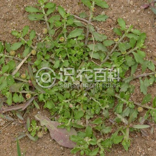 莖多分枝,高5-20厘米,匍匐狀,微被蛛絲狀毛或無毛。葉互生,楔狀倒披針形,長7-18毫米,頂端鈍,基部楔形,邊緣有少數鋸齒,無毛或背面微被蛛絲狀毛。頭狀花序小,扁球形,直徑約3毫米,單生于葉腋,無花序梗或極短;總苞半球形;總苞片2層,橢圓狀披針形,綠色,邊緣透明膜質,外層較大;邊緣花雌性,多層,花冠細管狀,長約0.2毫米,淡綠黃色,頂端2-3微裂;盤花兩性,花冠管狀,長約0.5毫米,頂端4深裂,淡紫紅色,下部有明顯的狹管。瘦果橢圓形,長約1毫米,具4棱,棱上有長毛,無冠狀冠毛。花果期6-10月。