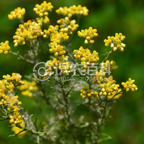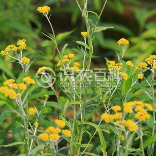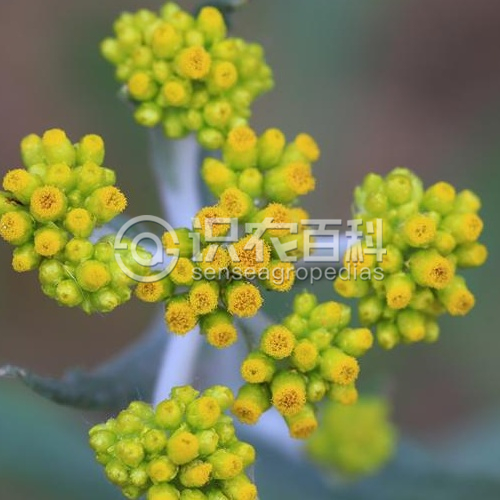 莖直立,高可達(dá)70厘米,基部徑約5毫米,基部通常木質(zhì),上部有斜升的分枝,有溝紋,被白色厚棉毛或于花期基部脫落變稀疏,節(jié)間短,長6-10毫米,上部的節(jié)間通常長不及5毫米。下部葉線形,無柄,長約8厘米,寬約3毫米,基部略狹,稍抱莖,頂端漸尖,上面有腺毛,或有時(shí)沿中脈被疏蛛絲狀毛,下面厚,被白色棉毛,葉脈1條,上面明顯,在下面不明顯;中部和上部葉較小。頭狀花序多數(shù),徑約4毫米,無或有短梗,在枝端密集成傘房花序;花黃色;總苞球形,徑約4毫米,長4-5毫米;總苞片4層,全部金黃色或黃色,有光澤,膜質(zhì)或上半部膜質(zhì),外層倒卵形,長3-5毫米,頂端圓或鈍,基部漸狹,背面被白色棉毛,內(nèi)層線形,長4-5毫米,頂端尖或銳尖,背面通常無毛。雌花多數(shù),花冠絲狀,長約3毫米,頂端3齒裂,無毛。兩性花較少數(shù),花冠管狀,長約4毫米,兩端向中部漸狹,檐部5淺裂,裂片卵狀漸尖,無毛。瘦果卵形或卵狀圓柱形,頂端截平,無毛,長約0.4毫米。冠毛絹毛狀,粗糙,污黃色,易脫落,長3-4毫米,基部分離?;ㄆ?-12月。