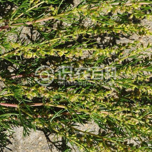 半灌木狀草本。主根木質,粗,側根多枚,明顯;根狀莖粗短,直徑1-3厘米,有少數營養枝。莖多數,直立,常成叢,高10-20厘米,稀達35厘米,略成四方形,密被灰白色短柔毛,不分枝或上部有少數貼向主軸的短分枝。葉多數,密集,近肉質,近無柄或無柄,兩面微被短柔毛;莖下部與中部葉卵形或寬卵形,長0.8-1.2厘米,寬0.7-1厘米,一至二回羽狀全裂或近掌狀全裂,每側有裂片2-3枚,小裂片狹線狀棒形或狹線形,長2-4毫米,寬0.5毫米,先端圓鈍或略膨大, 基部1對裂片半抱莖并成假托葉狀;上部葉與苞片葉5或3全裂。頭狀花序半球形或卵球形,直徑3-3.5(-4)毫米,有短梗或近無梗,在莖或莖的分枝上排成穗狀花序、穗狀花序式的總狀花序或為復穗狀花序,而在莖上再組成狹窄的圓錐花序;總苞片3-4層,外層總苞片長卵形或橢圓狀披針形,背面微被灰白色蛛絲狀短柔毛,邊膜質,中、內層總苞片橢圓形,近膜質,背面無毛;雌花1-3朵,花冠狹圓錐狀或狹管狀,檐部具2(-3)裂齒,花柱略伸出花冠外,先端2叉,叉端尖;兩性花8-20朵,花冠管狀,背面有腺點,花藥線形,先端附屬物尖,長三角形,基部圓鈍或微尖,花柱與花冠等長或略短于花冠,先端2叉,叉端近截形,有睫毛。瘦果小,倒卵形。花果期7-9月。