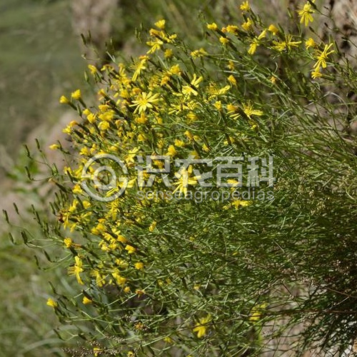 根木質,垂直直伸。莖直立,單生或少數莖成簇生,基部粗達4毫米,被褐色殘存的葉柄,自下部或基部傘房花序狀或傘房圓錐花序狀分枝,分枝斜升,全部莖枝無毛。基生葉多數或極多數,長7—17厘米,寬2—5厘米,羽狀全裂或深裂,側裂片6—12對,對生、偏斜對生或互生,長橢圓形、披針形、線形或線狀披針形,極少線狀絲形,頂端漸尖,邊緣全緣或有稀疏的鋸齒或線形的尖裂片,兩面無毛,葉柄長3—9厘米,柄基稍擴大,內面有棕色或淺褐色的長絨毛;中上部莖葉向上漸小,與基生同形并等樣分裂或線形不裂,有向基部漸狹短或稍長的翼柄;接頭狀花序分枝下部的葉或花序梗上的葉更小,線鉆形。頭狀花序直立、下傾或下垂,中等大小,有9—15枚舌狀小花,多數或少數在莖枝頂端排成傘房花序或傘房圓錐花序。總苞圓柱狀,長8—10毫米;總苞片4層,黑綠色,外層及最外層短小,長卵圓形,長達1.2毫米,寬約1毫米,頂端急尖,內層及最內層長,披針形,長8—10毫米,頂端急尖,全部總苞片外面被白色稀疏長且彎曲的絹毛,極少無毛,近頂端有角狀附屬物。舌狀小花黃色,花冠管外面有微柔毛。瘦果黑色或黑褐色,紡錘形,長4—6毫米,向頂端收窄,頂端無喙,有10一12條不等粗縱肋,肋上有小刺毛。冠毛白色,長4—6毫米,微粗糙。
