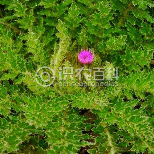 多年生鋪散草本。主根粗壯,直伸,生多數(shù)須根。莖基粗厚,無(wú)主莖,頂生多數(shù)或少數(shù)頭狀花序,外圍以多數(shù)密集排列的蓮座狀葉叢。全部葉基生,蓮座狀,長(zhǎng)橢圓形、橢圓狀披針形或倒披針形,羽狀淺裂、半裂、深裂至幾全裂,長(zhǎng)8-21厘米,寬2-6厘米,有長(zhǎng)1.5-4厘米的葉柄,兩面同色,綠色,下面色淡,沿脈有多細(xì)胞長(zhǎng)節(jié)毛;側(cè)裂片7-11對(duì),中部側(cè)裂片較大,向上向下的側(cè)裂片漸小,有時(shí)基部側(cè)裂片為針刺狀,除基部側(cè)裂片為針刺狀的以外,全部側(cè)片卵狀披針形、偏斜卵狀披針形、半橢圓形或?qū)捜切危吘売嗅槾袒虼笮〔坏鹊娜切未听X而齒頂有針刺,全部針刺長(zhǎng)2-5毫米。花序梗上的葉小,苞葉狀,邊緣針刺或淺刺齒裂。頭狀花序多數(shù)或少數(shù)集生于莖基頂端的蓮座狀葉叢中,花序梗極短(長(zhǎng)5-8毫米)或幾無(wú)花序梗。總苞寬鐘狀,無(wú)毛。總苞片3-5層,鑷合狀排列,或至少不呈明顯的覆瓦狀排列,近等長(zhǎng),中外層長(zhǎng)三角狀披針形或鉆狀披針形,包括頂端針刺長(zhǎng)1.8-2.3厘米,不包括邊緣針刺寬1-2毫米;內(nèi)層及最內(nèi)層披針形,長(zhǎng)達(dá)2.5厘米,頂端漸尖成長(zhǎng)達(dá)5毫米的針刺或膜質(zhì)漸尖而無(wú)針刺,全部苞片邊緣有針刺,針刺斜升或貼伏,長(zhǎng)2-3毫米,或最內(nèi)層邊緣有刺痕而不形成明顯的針刺。小花紫紅色,花冠長(zhǎng)2.1厘米,檐部長(zhǎng)8毫米,不等5淺裂,細(xì)管部長(zhǎng)1.3厘米。瘦果淺黑色,長(zhǎng)橢圓狀倒圓錐形,稍壓扁,長(zhǎng)5毫米,寬2毫米,頂端截形。冠毛白色或污白色或稍帶淺褐色;冠毛剛毛多層,基部連合成環(huán),整體脫落,向頂端漸細(xì),長(zhǎng)羽毛狀,長(zhǎng)達(dá)2厘米。花果期7-9月。