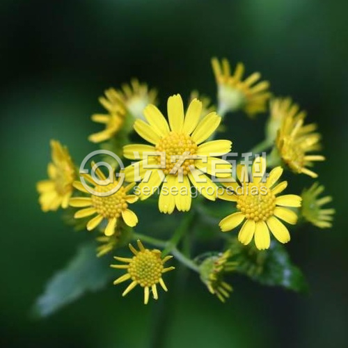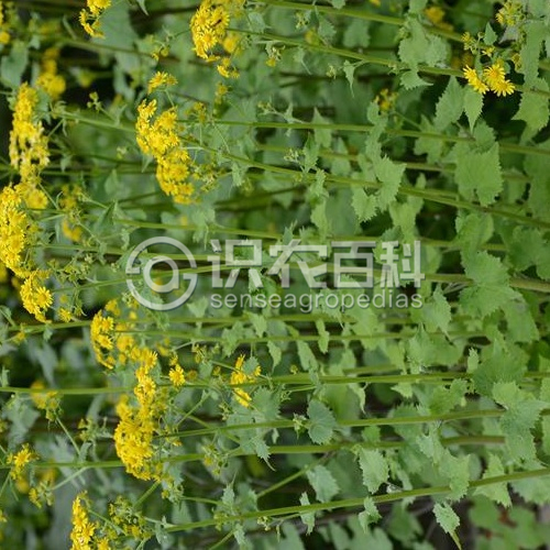 一年生或二年生草本,高30-80厘米。莖直立,單一或稍有分枝,具白色軟毛或近乎光滑。基生葉叢生,花后脫落,柄長3-6厘米,基部具鞘;葉片腎圓形,長約2.5厘米,寬約3厘米,邊緣具不整齊的三角形齒,上面稍有細毛,下面有白色蛛絲毛密生;中部葉有短柄,葉片腎圓形至廣卵狀心形,長3.5-4厘米,寬4-4.5厘米,先端短尖,被毛同基生葉;上部葉寬卵形,較小。春、夏季開花,頭狀花序小而多數,具細梗,排成傘房狀;總苞鐘形,基部無小苞,總苞片條狀披針形,邊緣膜質;緣花舌狀,1層,舌片橘黃色,橢圓形,先端全緣或3齒裂;中央管狀花多數,先端5裂。瘦果圓筒形,具縱棱,稍有細毛;冠毛白色,長約2-3毫米。
