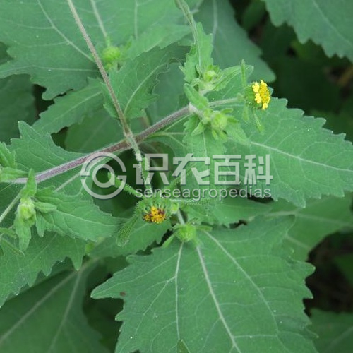 一年生草本。莖直立,高約30-100厘米,分枝斜升,上部的分枝常成復(fù)二歧狀;全部分枝被灰白色短柔毛。基部葉花期枯萎;中部葉三角狀卵圓形或卵狀披針形,長4-10厘米,寬1.8-6.5厘米,基部闊楔形,下延成具翼的柄,頂端漸尖,邊緣有規(guī)則的淺裂或粗齒,紙質(zhì),上面綠色,下面淡綠,具腺點,兩面被毛,三出基脈,側(cè)脈及網(wǎng)脈明顯;上部葉漸小,卵狀長圓形,邊緣淺波狀或全緣,近無柄。頭狀花序徑15-20毫米,多數(shù)聚生于枝端,排列成具葉的圓錐花序;花梗長1.5-4厘米,密生短柔毛;總苞闊鐘狀;總苞片2層,葉質(zhì),背面被紫褐色頭狀具柄的腺毛;外層苞片5-6枚,線狀匙形或匙形,開展,長8-11毫米,寬約1.2毫米;內(nèi)層苞片卵狀長圓形或卵圓形,長約5毫米,寬約1.5-2.2毫米。外層托片長圓形,內(nèi)彎,內(nèi)層托片倒卵狀長圓形。花黃色;雌花花冠的管部長0.7毫米;兩性管狀花上部鐘狀,上端有4-5卵圓形裂片。瘦果倒卵圓形,有4棱,頂端有灰褐色環(huán)狀突起,長3-3.5毫米,寬1-1.5毫米。花期4-9月,果期6-11月。