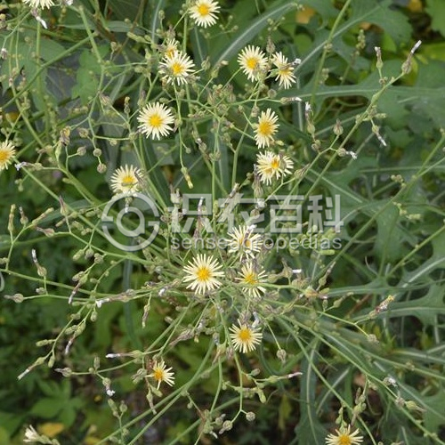 一年生草本,高50-80厘米。莖單生,直立,無毛或有時有白色莖刺,上部圓錐狀花序分枝或自基部分枝。中下部莖葉倒披針或長橢圓形,長3-7.5厘米,寬1-4.5厘米,倒向羽狀或羽狀淺裂、半裂或深裂,有時莖葉不裂,寬線形,無柄,基部箭頭狀抱莖,頂裂片與側裂大等大,三角狀卵形或菱形,或側裂片集中在葉的下部或基部而頂裂片較長,寬線形,側裂片3-6對,鐮刀形、三角狀鐮刀形或卵狀鐮刀形,最下部莖葉及接圓錐花序下部的葉與中下部莖葉同形或披針形、線狀披針形或線形,全部葉或裂片邊緣有細齒或刺齒或細刺或全緣,下面沿中脈有刺毛,刺毛黃色。頭狀花序多數,在莖枝頂端排成圓錐狀花序。總苞果期卵球形,長1.2厘米,寬約6毫米;總苞片約5層,外層及最外層小,長1-2毫米,寬1毫米或不足1毫米,中內層披針形,長7-12毫米,寬至2毫米,全部總苞片頂端急尖,外面無毛。舌狀小花15-25枚,黃色。瘦果倒披針形,長3.5毫米,寬1.3毫米,壓扁,淺褐色,上部有稀疏的上指的短糙毛,每面有8-10條高起的細肋,頂端急尖成細絲狀的喙,喙長5毫米。冠毛白色,微鋸齒狀,長6毫米?;ü?-8月。