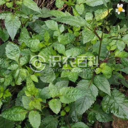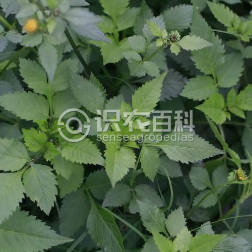 一年生草本。莖直立,高30-150厘米,略具四棱,無毛或被稀疏卷曲短柔毛,基部直徑1-9毫米。葉為一回羽狀復葉,頂生小葉卵形至長圓狀卵形或卵狀披針形,長2-7厘米,寬1-2.5厘米,先端漸尖,基部楔形,邊緣具稍密且近于均勻的鋸齒,有時一側深裂為一小裂片,兩面均被柔毛,側生小葉1-2對,卵形或卵狀長圓形,近頂部的一對稍小,通常不分裂,基部下延,無柄或具短柄,下部的一對約與頂生小葉相等,具明顯的柄,三出復葉狀分裂或僅一側具一裂片,裂片橢圓形,邊緣有鋸齒;總葉柄長1.5-5厘米,無毛或被疏柔毛。頭狀花序直徑7-10毫米,花序梗長1.5-5.5厘米,果時長4.5-11厘米??偘坑卸倘崦鈱影?-10枚,草質,條形,長3-6.5毫米,先端銳尖,背面密被短. 柔毛,內層苞片長橢圓形或長圓狀披針形,長5-6毫米,背面褐色,有深色縱條紋,被短柔毛。舌狀花通常3-5朵,不育,舌片淡黃色,長橢圓形,長約4毫米,寬2.5-3毫米,先端3齒裂,或有時無舌狀花;盤花筒狀,長4-5.5毫米,冠檐5齒裂。瘦果條形,黑色,長9-19毫米,寬1毫米,具四棱,兩端稍狹,多少被小剛毛,頂端芒刺3-4枚,長3-4毫米,具倒刺毛。
