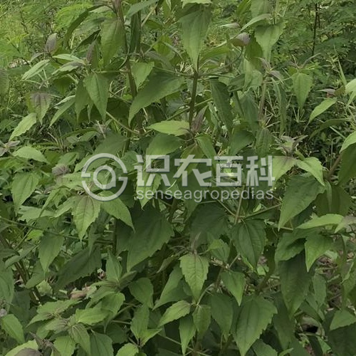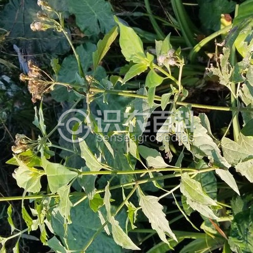 多年生草本植物,根莖粗壯,橫走。莖直立,高1-3米,蒼白色,有細條紋;分枝粗壯,常對生,水平射出,與主莖成直角,少有分披互生而與主莖成銳角的;全部莖枝被稠密黃色茸毛或短柔毛。葉對生,卵形、三角形或卵狀三角形,長4-10厘米,寬1.5-5厘米,質地稍厚,有葉柄,柄長1-2厘米,上面綠色,下面色淡,兩面粗澀,被長柔毛及紅棕色腺點,下面及沿脈的毛和腺點稠密,基部平截或淺心形或寬楔形,頂端急尖,基出三脈,側面纖細,在葉下面稍突起,邊緣有稀疏的粗大而不規則的圓鋸齒或全緣或僅一側有鋸齒或每側各有一個粗大的圓齒或三淺裂狀,花序下部的葉小,常全緣。 頭狀花序多數或少數在莖頂或枝端排成傘房狀或復傘房狀花序,花序徑常3-6厘米,少有13厘米的。花序梗粗壯,密被稠密的短柔毛。總苞圓柱形,長1厘米,寬4-5毫米,約含20個小花;總苞片3-4層,覆瓦狀排列,外層苞片卵形,長2毫米,外面被短柔毛,頂端鈍,向內漸長,中層及內層苞片長圓形,長7-8毫米,頂端漸尖;全部苞片有三條寬中脈,麥桿黃色,無腺點。花白色或粉紅色,花冠長5毫米。 瘦果黑褐色,長4毫米,5棱,無腺點,沿棱有稀疏的白色貼緊的順向短柔毛。花果期4-12月。