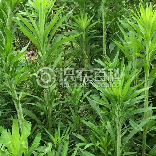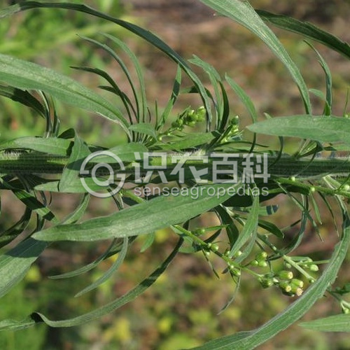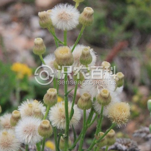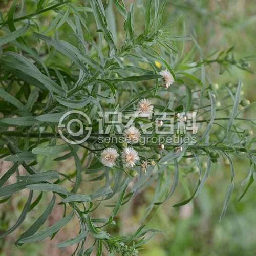 一年生或二年生草本,根紡錘狀,常斜升,具纖維狀根。 莖直立或斜升,高20-50厘米,稀更高,中部以上常分枝,常有斜上不育的側枝,密被貼短毛,雜有開展的疏長毛。葉密集,基部葉花期常枯萎,下部葉倒披針形或長圓狀披針形,長3-5厘米,寬0.3-1厘米,頂端尖或稍鈍,基部漸狹成長柄,通常具粗齒或羽狀淺裂,中部和上部葉具短柄或無柄,狹披針形或線形,長3-7厘米,寬0.3-0.5厘米,中部葉具齒,上部葉全緣,兩面均密被貼糙毛。 頭狀花序多數,徑約8-10毫米,在莖端排列成總狀或總狀圓錐花序,花序梗長10-15毫米;總苞橢圓狀卵形,長約5毫米,寬約8毫米,總苞片2-3層,線形,頂端尖,背面密被灰白色短糙毛,外層稍短或短于內層之半,內層長約4毫米,寬0.7毫米,具干膜質邊緣。花托稍平,有明顯的蜂窩孔,徑3-4毫米;雌花多層,白色,花冠細管狀,長3-3.5毫米,無舌片或頂端僅有3-4個細齒;兩性花淡黃色,花冠管狀,長約3毫米,管部上部被疏微毛,上端具5齒裂。瘦果線狀披針形,長1.5毫米,扁壓,被疏短毛;冠毛1層,淡紅褐色,長約4毫米。花期5-10月。