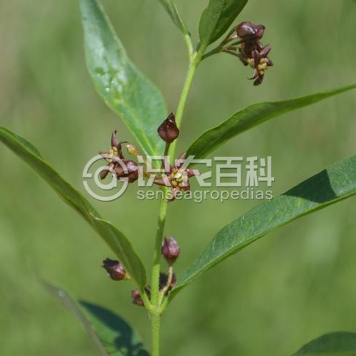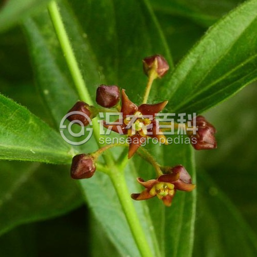 高達50厘米;根須狀;莖被有單列柔毛及幼嫩部分有微毛外,余皆無毛,單莖或略有分枝。葉對生,薄紙質,卵狀披針形,長3-10厘米,寬1-3厘米,頂端漸尖,基部寬楔形;側脈約4對,在邊緣網結,有時有邊毛;葉柄長約5毫米,頂端腺體成群。傘形聚傘花序腋生,長約2厘米,比葉為短,著花不到10朵;花萼5深裂,內面基部有小腺體5個;花冠紫紅色,裂片卵狀長圓形;花粉塊每室1個,下垂;副花冠肉質、裂片龍骨狀,在花藥基部貼生;柱頭圓形,略為突起。蓇葖雙生,狹披針形,向端部長漸尖,基部緊窄,外果皮有細直紋,長約7厘米,直徑5毫米;種子黃褐色,扁平,長圓形,長約5毫米,寬3毫米;種毛白色絹質,長2厘米。花期5-7月,果期6-8月。
