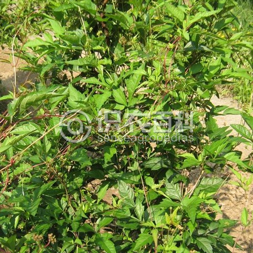 小枝圓柱形,有縱棱紋,被疏柔毛。卷須2-3叉分枝,相隔2節(jié)間斷與葉對生。葉為掌狀5小葉,小葉3-5羽裂,披針形或菱狀披針形,長4-9厘米,寬1.5-6厘米,頂端漸尖,基部楔形,中央小葉深裂,或有時外側(cè)小葉淺裂或不裂,上面綠色無毛或疏生短柔毛,下面淺綠色,無毛或脈上被疏柔毛;小葉有側(cè)脈3-6對,網(wǎng)脈不明顯;葉柄長1.5-2.5厘米,無毛或被疏柔毛,小葉幾無柄;托葉膜質(zhì),褐色,卵披針形,長約2.3毫米,寬1-2毫米,頂端鈍,無毛或被疏柔毛。花序為疏散的傘房狀復(fù)二歧聚傘花序,通常與葉對生或假頂生;花序梗長1.5-4厘米,無毛或被疏柔毛,花梗長1.5-2.5毫米,幾無毛;花蕾卵圓形,高2-3毫米,頂端圓形;萼碟形,波狀淺裂或幾全緣,無毛;花瓣5,卵圓形,高1.7-2.7毫米,無毛;雄蕊5,花藥卵圓形,長寬近相等;花盤發(fā)達(dá),邊緣呈波狀;子房下部與花盤合生,花柱鉆形,柱頭擴(kuò)大不明顯。果實近球形,直徑0.6-0.8厘米,有種子2-3顆,種子倒卵圓形,頂端圓形,基部有短喙,種臍在種子背面中部近圓形,種脊向上漸狹呈帶狀,腹部中梭脊微突出,兩則洼穴呈溝狀,從基部向上斜展達(dá)種子上部1/3。花期5-6月,果期8-9月。