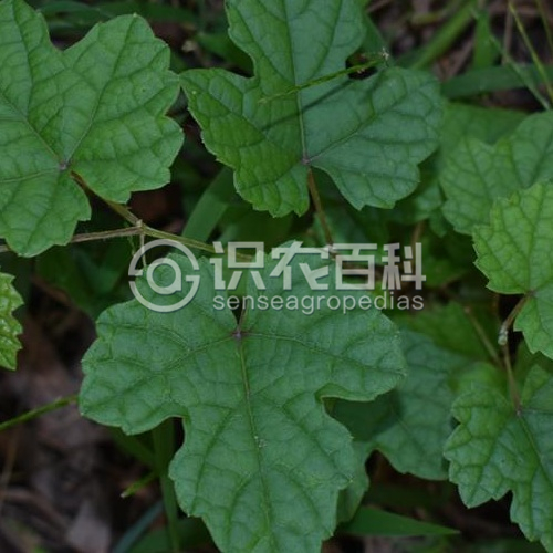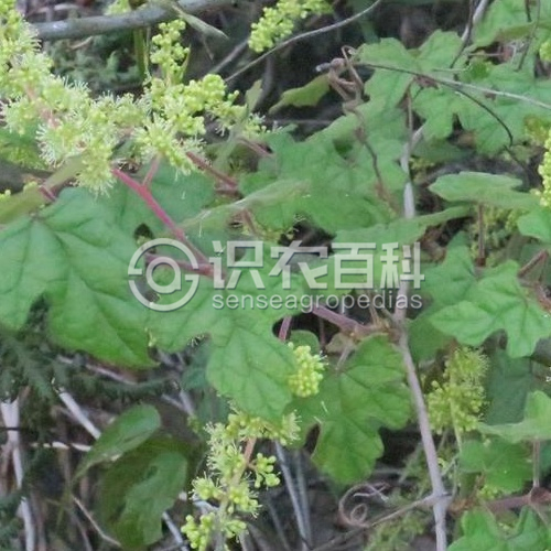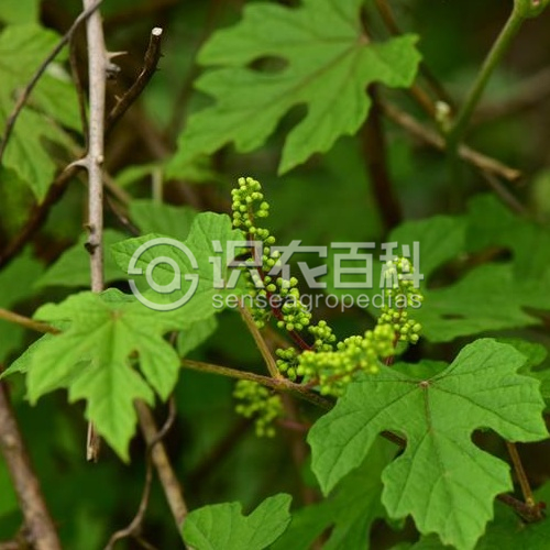 小枝圓柱形,有棱紋,嫩枝密被蛛絲狀絨毛或柔毛,以后脫落變稀疏。卷須2叉分枝,每隔2節(jié)間斷與葉對生。葉長圓卵形,長2.5-8厘米,寬2-5厘米,葉片3-5(7)深裂或淺裂,稀混生有不裂葉者,中裂片頂端急尖至漸尖,基部常縊縮凹成圓形,邊緣每側(cè)有9-16缺刻粗齒或成羽狀分裂,基部心形或深心形,基缺凹成圓形,下面密被蛛絲狀絨毛和柔毛,以后脫落變稀疏;基生脈5出,中脈有側(cè)脈4-6對,上面網(wǎng)脈不明顯或微突出,下面有時(shí)絨毛脫落后柔毛明顯可見;葉柄長0.5-4.5厘米,初時(shí)密被蛛絲狀絨毛或絨毛和柔毛,以后脫落變稀疏;托葉卵狀長圓形或長圓披針形,膜質(zhì),褐色,長3.5-8毫米,寬2.5-4毫米,頂端鈍,邊緣全緣,無毛或近無毛。花雜性異株,圓錐花序與葉對生,基部分枝發(fā)達(dá)或有時(shí)退化成一卷須,稀狹窄而基部分枝不發(fā)達(dá);花序梗長0.5-2.5厘米,初時(shí)被蛛狀絲絨毛,以后變稀疏;花梗長1.5-3毫米,無毛;花蕾倒卵橢圓形或近球形,高1.5-2.2毫米,頂端圓形;萼碟形,高約0.2毫米,近全緣,無毛;花瓣5,呈帽狀粘合脫落;雄蕊5,花絲絲狀,長1.5-1.8毫米,花藥黃色,橢圓形,長0.4-0.5毫米,在雌花內(nèi)雄蕊短而不發(fā)達(dá),敗育;花盤發(fā)達(dá),5裂;雌蕊1,子房橢圓卵形,花柱細(xì)短,柱頭擴(kuò)大。果實(shí)球形,成熟時(shí)紫紅色,直徑0.5-0.8厘米;種子倒卵形,頂端微凹,基部有短喙,種臍在種子背面中部呈圓形或橢圓形,腹面中棱脊突出,兩側(cè)洼穴狹窄,向上達(dá)種子3/4處?;ㄆ?-8月,果期6-10月。