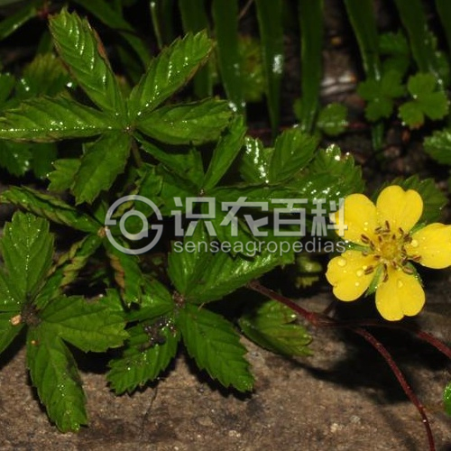 多年生匍匐草本。根多分枝,常具紡錘狀塊根。匍匐枝長20-100厘米,節上生不定根,被稀疏柔毛或脫落幾無毛。基生葉為鳥足狀5出復葉,連葉柄長7-12厘米,葉柄被疏柔毛或脫落幾無毛,小葉有短柄或幾無柄;小葉片倒卵形至倒卵圓形,頂端圓鈍,基部楔形,邊緣有急尖或圓鈍鋸齒,兩面綠色,上面幾無毛,下面被疏柔毛;纖匍枝上葉與基生葉相似;基生葉托葉膜質,褐色,外面幾無毛,匍匐枝上托葉草質,綠色,卵狀長圓形或卵狀披針形,全緣稀有1-2齒,頂端漸尖或急尖。單花自葉腋生或與葉對生,花梗長6-9厘米,被疏柔毛;花直徑1.5-2.2厘米;萼片卵狀披針形,頂端急尖,副萼片長橢圓形或橢圓披針形,頂端急尖或圓鈍,與萼片近等長,外面被疏柔毛,果時顯著增大;花瓣黃色,寬倒卵形,頂端顯著下凹,比萼片稍長;花柱近頂生,基部細,柱頭擴大。瘦果黃褐色,卵球形,外面被顯著點紋。花果期6-8月。