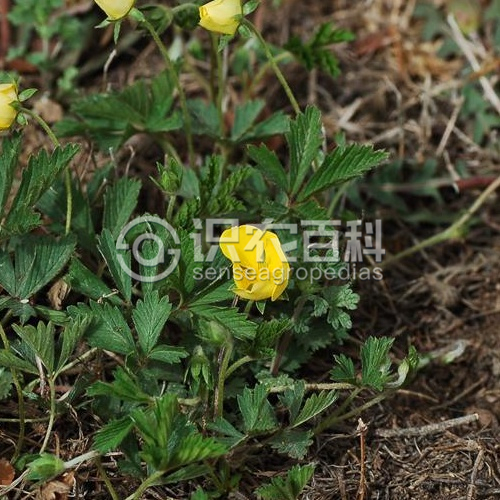 多年生匍匐草本。根多分枝,常具紡錘狀塊根。匍匐枝長20-100厘米,節上生不定根,被稀疏柔毛或脫落幾無毛。基生葉為鳥足狀5出復葉,連葉柄長7-12厘米,葉柄被疏柔毛或脫落幾無毛,小葉有短柄或幾無柄;小葉片倒卵形至倒卵圓形,頂端圓鈍,基部楔形,邊緣有急尖或圓鈍鋸齒,兩面綠色,上面幾無毛,下面被疏柔毛;纖匍枝上葉與基生葉相似;基生葉托葉膜質,褐色,外面幾無毛,匍匐枝上托葉草質,綠色,卵狀長圓形或卵狀披針形,全緣稀有1-2齒,頂端漸尖或急尖。單花自葉腋生或與葉對生,花梗長6-9厘米,被疏柔毛;花直徑1.5-2.2厘米;萼片卵狀披針形,頂端急尖,副萼片長橢圓形或橢圓披針形,頂端急尖或圓鈍,與萼片近等長,外面被疏柔毛,果時顯著增大;花瓣黃色,寬倒卵形,頂端顯著下凹,比萼片稍長;花柱近頂生,基部細,柱頭擴大。瘦果黃褐色,卵球形,外面被顯著點紋。花果期6-8月。
