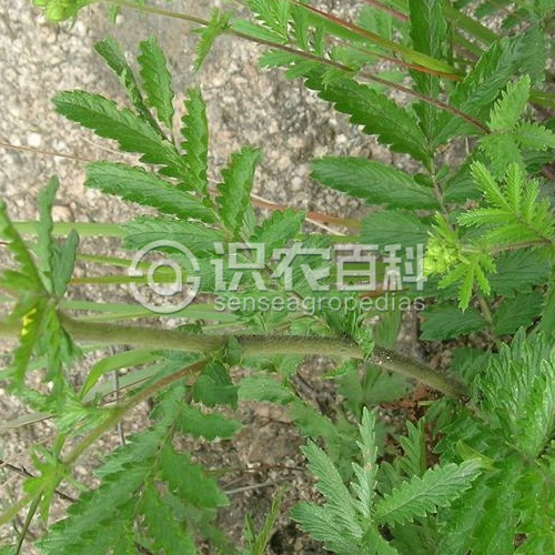 多年生草本。根粗壯,圓柱形?;ㄇo直立或微上升,高30-90厘米,被短柔毛,長柔毛及腺體?;~羽狀復葉,有小葉4-5對,連葉柄長10-30厘米,葉柄被短柔毛、長柔毛及腺體,小葉對生,稀互生,無柄,最上面1-3對小葉基部下延與葉軸匯合;小葉片長圓披針形至倒披針形,長1.5-8厘米,寬0.5-2.5厘米,頂端圓鈍或急尖,邊緣有缺刻狀鋸齒,上面被疏柔毛或脫落無毛,下面被短柔毛及腺體,沿脈疏生長柔毛;莖生葉與基生葉相似;基生葉托葉膜質,褐色,外被短柔毛及長柔毛,莖生葉托葉草質,綠色,全緣或分裂,外被短柔毛及長柔毛。傘房花序集生于花莖頂端,少花,花梗短;花直徑1.5-1.8厘米;萼片三角披針形,頂端通常漸尖,副萼片長圓披針形,頂端漸尖或圓鈍,與萼片近等長或稍短,外面密被短柔毛及腺體;花瓣寬倒卵形,頂端微凹,與萼片近等長,果時直立增大;花柱近頂生, 圓錐形,基部明顯具乳頭,膨大,柱頭不擴大。瘦果近腎形或卵球形,直徑約1毫米,光滑?;ü?-9月。