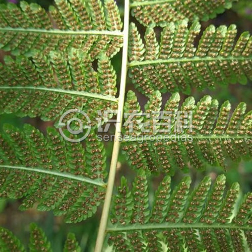 植株高可達1米。根狀莖長而橫走,密被銹黃色柔毛,以后逐漸脫落。葉遠生;柄長20-80厘米,基部粗3-6毫米,褐棕色或棕禾稈色,略有光澤,光滑,上面有淺縱溝1條;葉片闊三角形或長圓三角形,長30-60厘米,寬20-45厘米,先端漸尖,基部圓楔形,三回羽狀;羽片4-6對,對生或近對生,斜展,基部一對最大(向上幾對略變小),三角形,長15-25厘米,寬14-18厘米,柄長約3-5厘米,二回羽狀;小羽片約10對,互生,斜展,披針形,長6-10厘米,寬1.5-2.5厘米,先端尾狀漸尖(尾尖頭的基部略呈楔形收縮),基部近平截,具短柄,一回羽狀;裂片10-15對,平展,彼此接近,長圓形,長約14毫米,寬約5毫米,鈍頭或近圓頭,基部不與小羽軸合生,分離,全緣;中部以上的羽片逐漸變為一回羽狀,長圓披針形,基部較寬,對稱,先端尾狀,小羽片與下部羽片的裂片同形,部分小羽片的下部具1-3對淺裂片或邊緣具波狀圓齒。葉脈稠密,僅下面明顯。葉干后近革質或革質,暗綠色,上面無毛,下面在裂片主脈上多少被棕色或灰白色的疏毛或近無毛。葉軸及羽軸均光滑,小羽軸上面光滑,下面被疏毛,少有密毛,各回羽軸上面均有深縱溝1條,溝內無毛。