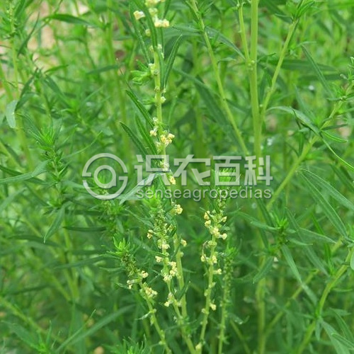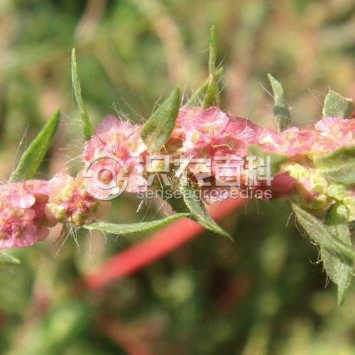 高50-100厘米。根略呈紡錘形。莖直立,圓柱狀,淡綠色或帶紫紅色,有多數(shù)條棱,稍有短柔毛或下部幾無毛;分枝稀疏,斜上。葉為平面葉,披針形或條狀披針形,長2-5厘米,寬3-7毫米,無毛或稍有毛,先端短漸尖,基部漸狹入短柄,通常有3條明顯的主脈,邊緣有疏生的銹色絹狀緣毛;莖上部葉較小,無柄,1脈。花兩性或雌性,通常1-3個生于上部葉腋,構(gòu)成疏穗狀圓錐狀花序,花下有時有銹色長柔毛;花被近球形,淡綠色,花被裂片近三角形,無毛或先端稍有毛;翅端附屬物三角形至倒卵形,有時近扇形,膜質(zhì),脈不很明顯,邊緣微波狀或具缺刻;花絲絲狀,花藥淡黃色;柱頭2,絲狀,紫褐色,花柱極短。胞果扁球形,果皮膜質(zhì),與種子離生。種子卵形,黑褐色,長1.5-2毫米,稍有光澤;胚環(huán)形,胚乳塊狀。花期6-9月,果期7-10月。