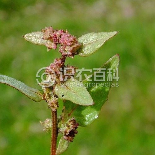 一年生草本,高20-40厘米。莖平臥或斜升,多分枝,圓柱狀或有鈍棱,具綠色色條。葉片卵形至寬卵形,通常三淺裂,長1.5-3厘米,寬1-2.5厘米,上面灰綠色,無粉或稍有粉,下面蒼白色,有密粉,具互生浮凸的離基三出脈,基部寬楔形;中裂片全緣,很少微有圓齒, 先端鈍或急尖并有短尖頭; 側裂片位于葉片中部或稍下,鈍而全緣;葉柄長1-3厘米,細瘦。花數個簇生,再于小分枝上排列成短于葉的腋生圓錐狀花序; 花被裂片5,較少為4,卵形,先端鈍,背面微具縱隆脊,邊緣膜質并帶黃色,果時通常閉合;雄蕊與花被同數,開花時花藥伸出花被; 柱頭2,很少為3,絲形。果皮膜質,黃褐色,與種子貼生。種子橫生,雙凸鏡狀,直徑1-1.2毫米,黑色,稍有光澤,表面具蜂窩狀細洼。花果期8-9月