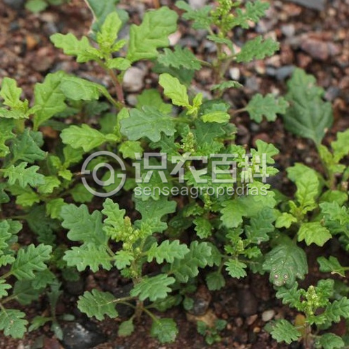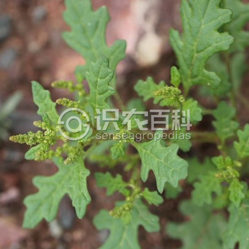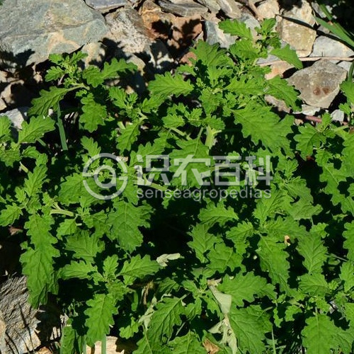 一年生草本,高20-60厘米,有強烈氣味,全體有具節(jié)的疏生短柔毛。莖直立,具綠色色條,通常有分枝。葉片矩圓形,長2-6厘米,寬1.5-3.5厘米,邊緣羽狀淺裂至羽狀深裂,先端鈍或漸尖,有時具短尖頭,基部漸狹,上面無毛或幼嫩時稍有毛,下面有具節(jié)的短柔毛并兼有黃色無柄的顆粒狀腺體,很少近于無毛;葉柄長2-10毫米。復二歧聚傘花序腋生;花兩性;花被直徑1-1.5毫米,5深裂; 裂片卵形至狹卵形,有狹膜質邊緣,背面通常有具刺狀突起的縱隆脊并有短柔毛和顆粒狀腺體,果時開展;雄蕊5,花絲扁平,花藥近球形。胞果扁球形,果皮膜質。種子橫生,周邊鈍,直徑0.5-0.8毫米,紅褐色或黑色,有光澤,具細網(wǎng)紋;胚半環(huán)形,圍繞胚乳。花期7-9月,果期9-10月。