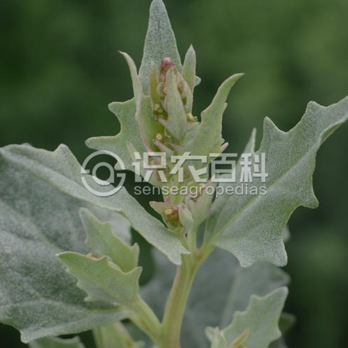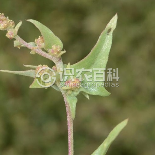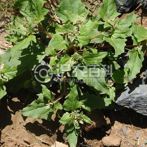 一年生草本,高20-50厘米。莖通常自基部分枝;枝外傾或斜伸,鈍四棱形,無色條,有粉。葉片卵狀三角形至菱狀卵形,長3-5厘米,寬1.5-3厘米,先端微鈍,基部圓形或?qū)捫ㄐ危吘壘呤桎忼X,近基部的1對齒較大而呈裂片狀,或僅有1對淺裂片而其余部分全緣,上面灰綠色,無粉或稍有粉,下面灰白色,有密粉;葉柄長3-6毫米。團(tuán)傘花序腋生;雄花花被5深裂,裂片寬卵形至卵形;雄蕊5,花絲扁平,基部連合,花藥寬卵形至短矩圓形,長約0.4毫米;雌花的苞片連合成筒狀,僅頂緣分離,果時(shí)臌脹,略呈倒卵形,長5-6毫米(包括柄),寬約4毫米,木質(zhì)化,表面具多數(shù)不規(guī)則的棘狀突起,頂緣薄,牙齒狀,基部楔形。胞果扁平,卵形或近圓形;果皮膜質(zhì), 白色,與種子貼伏。種子直立,紅褐色或黃褐色,直徑2-2.5毫米。花期6-7月,果期8-9月。