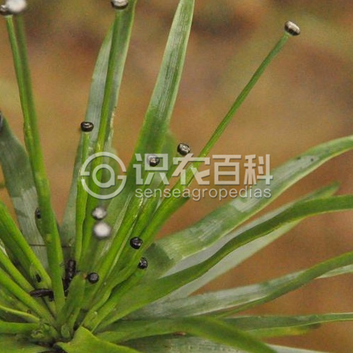 草本,葉線形,叢生,長2.5-4厘米,中部寬1-1.8(-3)毫米,半透明,具橫格,脈6-9(-11)條,花葶7-15(-∞)個,長11-15(-20)厘米,直徑0.3-0.4毫米,扭曲,具4-5棱,鞘狀苞片長2.5-4厘米,口部斜裂,膜質;花序熟時近球形,灰黑色,長3.5-4毫米,寬4-5毫米;總苞片橢圓形至倒卵形,禾稈色,硬膜質,稍反折,長1.6-1.9(-2.3)毫米,寬1.4-1.5毫米,背部在顯微鏡下能見有稀疏的單細胞短毛;總(花)托有密毛;苞片倒卵形至倒披針形,長1.5(-2)毫米,寬0.6-1.5毫米,背面上部及頂端有白色短毛;雄花:花萼漏斗狀前面開裂,上端近截形或鈍頭,3淺裂至深裂,長1.6-2.3毫米,背面上部及頂端有白短毛;花冠3裂,近頂端常各有1棕色至灰色的腺體,遠軸裂片稍大,矩圓狀三角形,端部及內面有白短毛,側片較小,毛較少或無;雄蕊6枚,花藥黑色;雌花:萼片3枚,舟形,稍黑色,背都有狹龍骨狀突起,先端圓鈍至急尖,長1.2-1.8(-2)毫米,上部及頂端有白短毛;花瓣3枚,倒披針狀線形,膜質稍厚,近頂端處無腺或各有1小腺,頂端有白短毛,側面及腹面的毛稍長;子房3室,花柱分枝3,長于或等于花柱。種子卵形,長0.33-0.5毫米,表面具橫格,每格邊緣伸出1-6根向下的條狀突起。花果期9-11月。