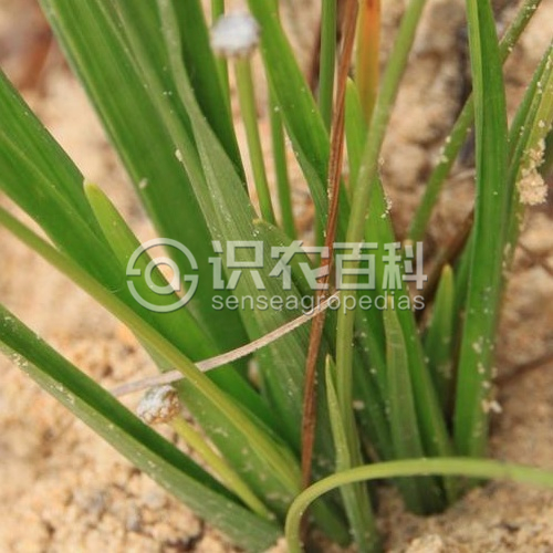 大型草本.葉狹帶形,叢生,長10-35厘米,寬2-3毫米,基部寬4-5毫米,先端加厚而尖,二面疏被長柔毛,對光能見橫格,脈10-15條。花葶10個左右,長15-73厘米,干時粗0.8-1.7毫米,扭轉,具棱5-7條,鞘狀苞片長6-20厘米,被長柔毛,口部斜裂;花序熟時近球形,基部平截,灰白色,堅實,不壓扁,直徑約6毫米;總苞片圓腎形至卵狀楔形,禾稈色,開展而不反折,軟骨質,直徑2-2.5毫米,背面常有疏毛,位于下半部的毛較長;總(花)托有毛;苞片倒卵形至菱狀楔形,長2.3-3.2毫米,寬1.6-3毫米,背面上部密生白短毛;雄花:花萼合生,長2-2.3毫米,3裂,側片舟狀,背面頂部有毛,具翅;中片條形,與側片全結合或大部分結合,無毛;花冠3裂,裂片條形,各有1黑色長卵狀腺體,上部有白短毛;雄蕊6枚,花藥黑色;雌花:萼片3枚,離生,長2-2.3毫米,側萼片有寬翅,背面頂部有毛;中萼片線形,無毛;花瓣3枚,線形,稍肉質,近頂端處各有1黑色長橢圓形的腺體,端部具白短毛,中部疏生長柔毛;子房3室,花柱分枝3,短于花柱。種子卵圓形,長0.65-0.8毫米,表面具橫格,每格具1-2T字形突起。花果期夏秋季。