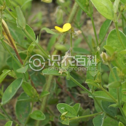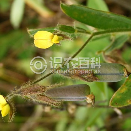 草本,基部常木質,高60-120厘米;莖直立或鋪地蔓延,具多分枝,被棕黃色伸展的長柔毛。 托葉披針形或三角狀披針形,長5-8毫米;單葉,葉片橢圓形,長2-6厘米,寬1-3厘米,兩面被毛,尤以葉下面葉脈上的毛更密,先端鈍或漸尖,基部略楔形,側脈隱見。 總狀花序頂生或腋生,有花2-6朵;苞片披針形,長2-4毫米,小苞片與苞片同型,生萼筒基部;花梗長3-5毫米;花萼二唇形,長10-12毫米,密被粗糙的長柔毛,深裂,幾達基部,萼齒披針形;花冠黃色,旗瓣長橢圓形,長8-10毫米,翼瓣長圓形,長約8毫米,龍骨瓣與翼瓣等長,中部以上變狹形成長喙,包被萼內或與之等長;子房無柄。 莢果長圓形,無毛,長2-3厘米;種子20-30顆。 花果期6-12月間。