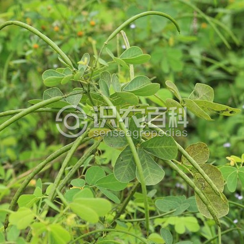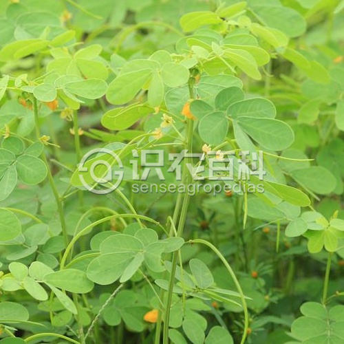 直立、粗壯、一年生亞灌木狀草本,高1-2米。葉長4-8厘米;葉柄上無腺體;葉軸上每對小葉間有棒狀的腺體1枚;小葉3對,膜質,倒卵形或倒卵狀長橢圓形,長2-6厘米,寬1.5-2.5厘米,頂端圓鈍而有小尖頭,基部漸狹,偏斜,上面被稀疏柔毛,下面被柔毛;小葉柄長1.5-2毫米;托葉線狀,被柔毛,早落。花腋生,通常2朵聚生;總花梗長6-10毫米;花梗長1-1.5厘米,絲狀;萼片稍不等大,卵形或卵狀長圓形,膜質,外面被柔毛,長約8毫米;花瓣黃色,下面二片略長,長12-15毫米,寬5-7毫米;能育雄蕊7枚,花藥四方形,頂孔開裂,長約4毫米,花絲短于花藥;子房無柄,被白色柔毛。莢果纖細,近四棱形,兩端漸尖,長達15厘米,寬3-4毫米,膜質;種子約25顆,菱形,光亮。花果期8-11月。