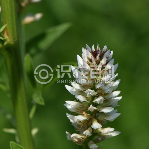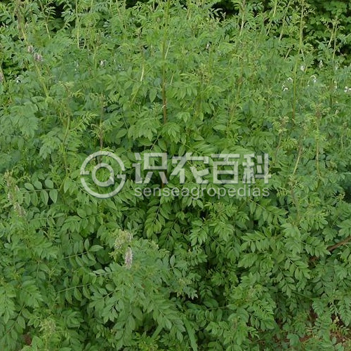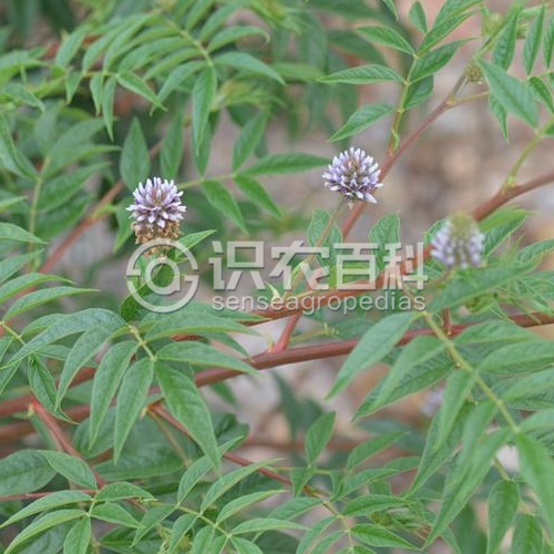 多年生草本。根和根狀莖無甜味。莖直立,多分枝,高1-1.5米,具條棱,密被黃褐色鱗片狀腺點,幾無毛。葉長6-20厘米;托葉披針形,長約5毫米;葉柄無毛,密生腺點;小葉9-15枚,披針形或卵狀披針形,長2-6厘米,寬1.5-2厘米,上面深綠色,下面淡綠色,兩面均密被鱗片狀腺體,無毛,頂端漸尖,具短尖,基部楔形,邊緣具微小的鉤狀細齒。總狀花序腋生,花密集成球狀;總花梗短于葉,密生短柔毛及黃色鱗片狀腺點;苞片卵狀披針形,長6-8毫米,膜質,具腺點;花萼鐘狀,長4-5毫米,密被腺點,基部常疏被短柔毛;萼齒5,披針形,與萼筒近等長;花冠淡紫色、紫色或淡紫紅色,旗瓣卵圓形,長6-8毫米,頂端圓,基部具短瓣柄,翼瓣長5-6毫米,龍骨瓣稍短于翼瓣。果序呈橢圓狀,莢果卵圓形,長10-17毫米,寬6-8毫米,頂端具突尖,外面被長約5毫米剛硬的刺。種子2枚,黑色,圓腎形,長約2毫米。花期6-7月,果期7-9月。