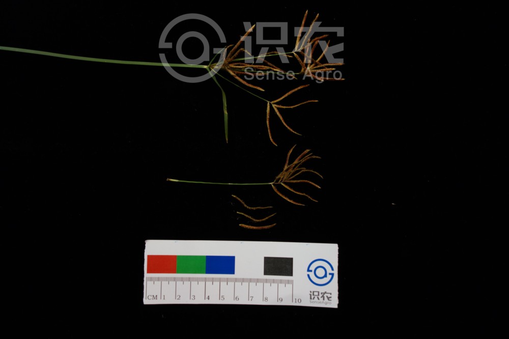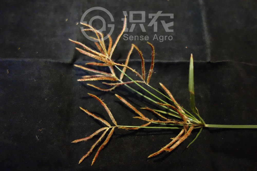 匍匐根狀莖長,具橢圓形塊莖。稈稍細弱,高15-95厘米,銳三稜形,平滑,基部呈塊莖狀。葉較多,短于稈,寬2-5毫米,平張;鞘棕色,常裂成纖維狀。葉狀苞片2-3(-5) 枚,常長于花序,或有時短于花序;長側枝聚繖花序簡單或復出,具(2-)3-10個輻射枝;輻射枝最長達12厘米;穗狀花序輪廓為陀螺形,稍疏松,具3-10個小穗;小穗斜展開,線形,長1-3厘米,寬約1.5毫米,具8-28朵花;小穗軸具較寬的、白色透明的翅;鱗片稍密地復瓦狀排列,膜質,卵形或長圓狀卵形,長約3毫米,頂端急尖或鈍,無短尖,中間綠色,兩側紫紅色或紅棕色,具5-7條脈;雄蕊3,花藥長,線形,暗血紅色,藥隔突出于花藥頂端;花柱長,柱頭3,細長,伸出鱗片外。小堅果長圓狀倒卵形,三稜形,長為鱗片的1/3-2/5,具細點。花果期5-11月。