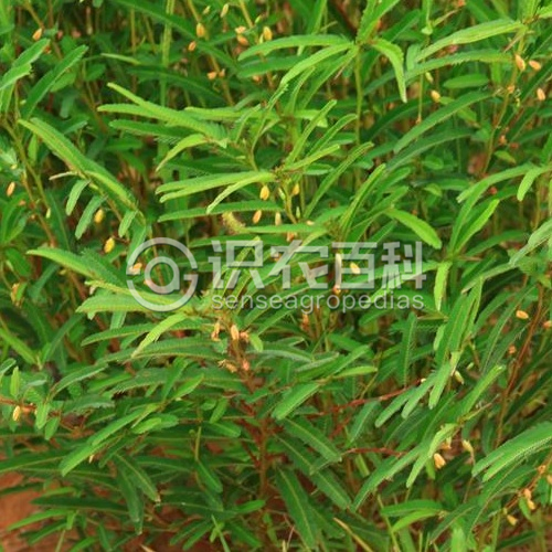 一年生或多年生亞灌木狀草本,高30-60厘米,多分枝;枝條纖細,被微柔毛。葉長4-8厘米,在葉柄的上端、最下一對小葉的下方有圓盤狀腺體1枚;小葉20-50對,線狀鐮形,長3-4毫米,寬約1毫米,頂端短急尖,兩側不對稱,中脈靠近葉的上緣,干時呈紅褐色;托葉線狀錐形,長4-7毫米,有明顯肋條,宿存。花序腋生,1或數朵聚生不等,總花梗頂端有2枚小苞片,長約3毫米;萼長6-8毫米,頂端急尖,外被疏柔毛;花瓣黃色,不等大,具短柄,略長于萼片;雄蕊10枚,5長5短相間而生。莢果鐮形,扁平,長2.5-5厘米,寬約4毫米,果柄長1.5-2厘米;種子10-16顆。花果期通常8-10月。