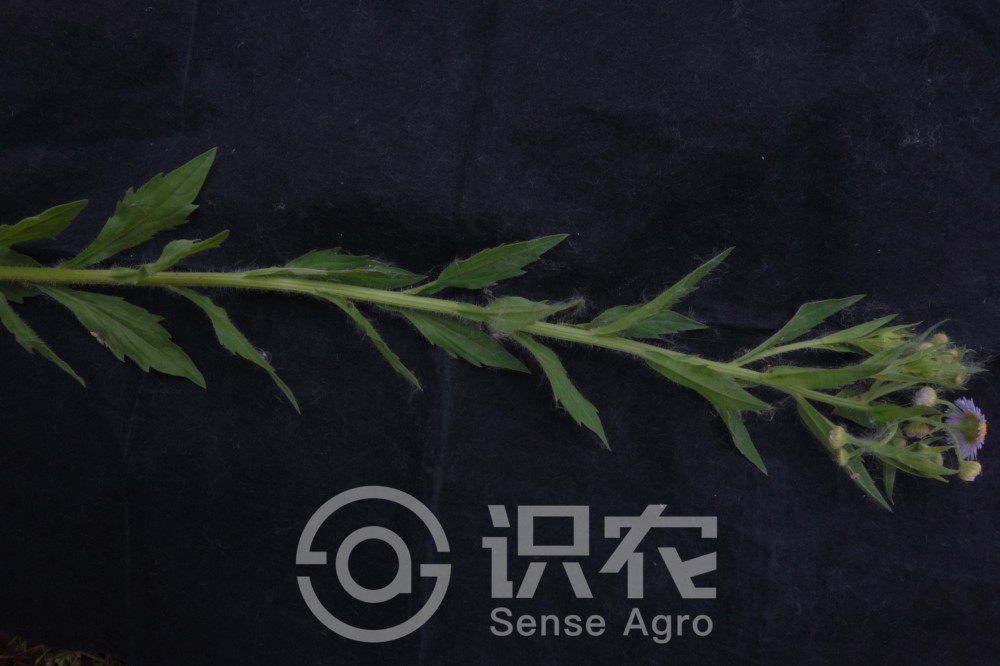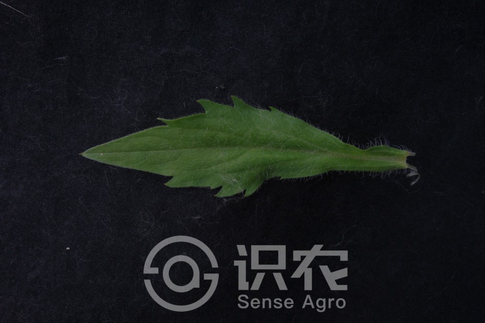 莖粗壯,高30-100厘米,基部徑6毫米,直立,上部有分枝,綠色,下部被開展的長硬毛,上部被較密的上彎的短硬毛。基部葉花期枯萎,長圓形或寬卵形,少有近圓形,長4-17厘米,寬1.5-4厘米,或更寬,頂端尖或鈍,基部狹成具翅的長柄,邊緣具粗齒,下部葉與基部葉同形,但葉柄較短,中部和上部葉較小,長圓狀披針形或披針形,長1-9厘米,寬0.5-2厘米,頂端尖,具短柄或無柄,邊緣有不規則的齒或近全緣,最上部葉線形,全部葉邊緣被短硬毛,兩面被疏短硬毛,或有時近無毛。頭狀花序數個或多數,排列成疏圓錐花序,長6-8毫米,寬10-15毫米,總苞半球形,總苞片3層,草質,披針形,長3-5毫米,寬0.5-1毫米,近等長或外層稍短,淡綠色或多少褐色,背面密被腺毛和疏長節毛;外圍的雌花舌狀,2層,長6-8毫米,管部長1-1.5毫米,上部被疏微毛,舌片平展,白色,或有時淡天藍色,線形,寬0.6毫米,頂端具2小齒,花柱分枝線形;中央的兩性花管狀,黃色,管部長約0.5毫米,檐部近倒錐形,裂片無毛;瘦果披針形,長約1.2毫米,扁壓,被疏貼柔毛;冠毛異形,雌花的冠毛極短,膜片狀連成小冠,兩性花的冠毛2層,外層鱗片狀,內層為10-15條長約2毫米的剛毛。花期6-9月。