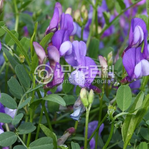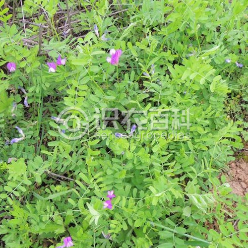 一二年生纏繞或匍匐伏草本,高15-40 (-50) 厘米。莖有棱,多分枝,近無毛偶數羽狀復葉頂端卷須有分枝;托葉半箭頭形,長0.3-0.7厘米,有鋸齒;小葉3-5對,長圓形或狹倒卵長圓形,長1-2.5厘米,寬0.2-0.8厘米,先端平截微凹,稀齒狀,上面葉脈不甚清晰,下面葉脈明顯被疏柔毛。總狀花序長于葉或與葉軸近等長;具花2-4 (-5) 朵,著生于花序軸頂端,長2-2.5厘米,萼鐘形,被疏柔毛,萼齒披針形;花冠紅紫色或金藍紫色,旗瓣倒卵披針形,先端微缺,翼瓣短于旗瓣,長于龍骨瓣;子房柄細長,沿腹縫線被金色絹毛,花柱上部被長柔毛。莢果扁長圓形,長2.5-3.5厘米,寬約0.7厘米。種子2-8,球形,直徑約0.3厘米。花期4-5月,果期6-7月。