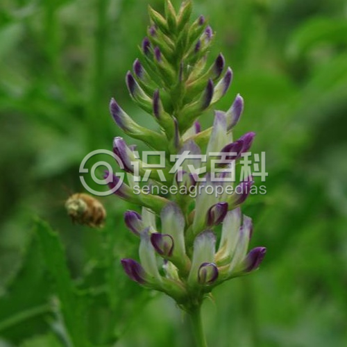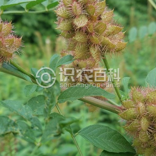多年生草本;根與根狀莖粗狀,直徑1-3厘米,外皮褐色,里面淡黃色,具甜味。莖直立,多分枝,高30-120厘米,密被鱗片狀腺點、刺毛狀腺體及白色或褐色的絨毛,葉長5-20厘米;托葉三角狀披針形,長約5毫米,寬約2毫米,兩面密被白色短柔毛;葉柄密被褐色腺點和短柔毛;小葉5-17枚,卵形、長卵形或近圓形,長1.5-5厘米,寬0.8-3厘米,上面暗綠色,下面綠色,兩面均密被黃褐色腺點及短柔毛,頂端鈍,具短尖,基部圓,邊緣全緣或微呈波狀,多少反卷。總狀花序腋生,具多數花,總花梗短于葉,密生褐色的鱗片狀腺點和短柔毛;苞片長圓狀披針形,長3-4毫米,褐色,膜質,外面被黃色腺點和短柔毛;花萼鐘狀,長7-14毫米,密被黃色腺點及短柔毛,基部偏斜并膨大呈囊狀,萼齒5,與萼筒近等長,上部2齒大部分連合;花冠紫色、白色或黃色,長10-24毫米,旗瓣長圓形,頂端微凹,基部具短瓣柄,翼瓣短于旗瓣,龍骨瓣短于翼瓣;子房密被刺毛狀腺體。莢果彎曲呈鐮刀狀或呈環狀,密集成球,密生瘤狀突起和刺毛狀腺體。種子3-11,暗綠色,圓形或腎形,長約3毫米。花期6-8月,果期7-10月。