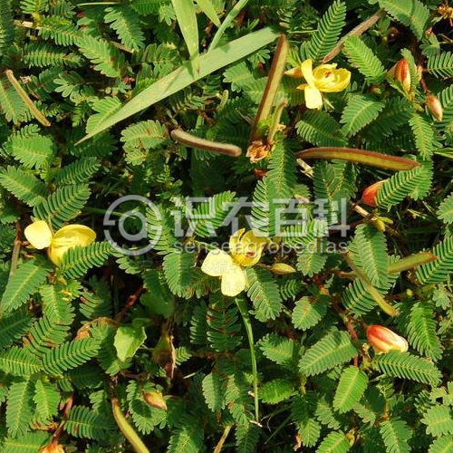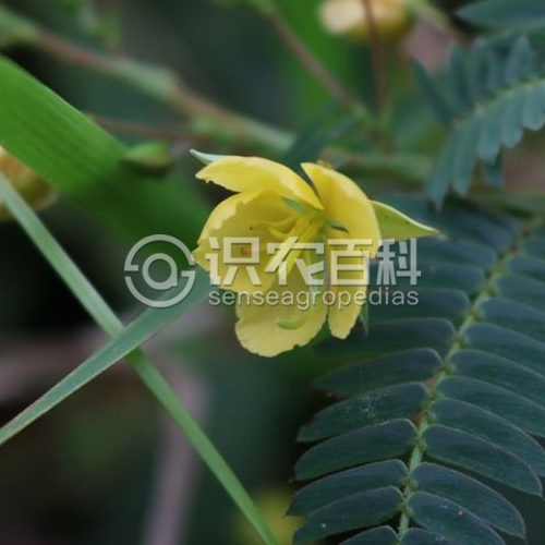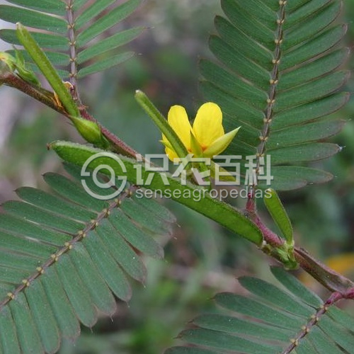 一年生或多年生亞灌木狀草本,高30-80厘米,有時可達1米;莖直立,分枝,嫩枝密生黃色柔毛。葉長3-8厘米,在葉柄的上端有圓盤狀腺體1枚;小葉14-25對,線狀鐮形,長8-13(-15)毫米,寬2-3毫米,兩側不對稱,中脈靠近葉的上緣;托葉線狀錐形,長7-9毫米,宿存。花序腋生,有花1或數朵不等;總花梗頂端的小苞片長約5毫米;萼片5,長約1厘米,帶狀披針形,外面疏被黃色柔毛;花冠橙黃色,花瓣稍長于萼片或與萼片等長;雄蕊10枚,或有時1-3枚退化;子房密被白色柔毛。莢果扁平,長2.5-5厘米,寬約5毫米,有8-16粒種子。花期6-8月;果期9-11月。