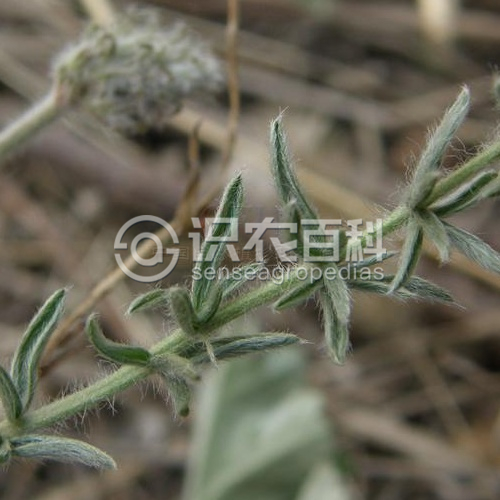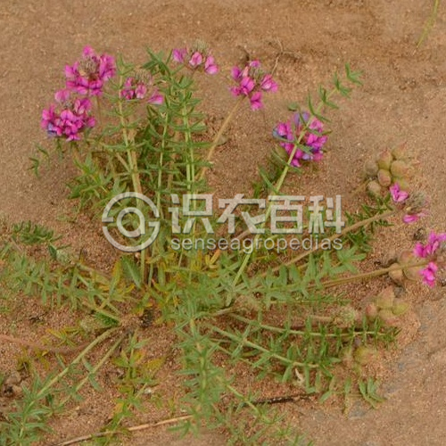 多年生草本,高5-15 (-30) 厘米。根淡褐色,圓柱形,較長。莖縮短,多頭。輪生羽狀復葉長5-14厘米;托葉膜質,卵形,大部與葉柄貼生,分離部分先端尖,被柔毛;葉柄與葉軸上面有細溝紋。密被長柔毛;小葉輪生,6-12輪,每輪4-6片,或有時為2小葉對生,長圓形、線形或披針形,長5-10毫米,寬1-2毫米,先端尖,基部楔形,邊緣有時內卷,兩面密被貼伏長柔毛。頂生頭形總狀花序;總花梗長6-15厘米,被微卷曲絨毛;苞片披針形,比花萼短而宿存;花長8-12毫米;花萼管狀鐘形,長5-7毫米,萼齒線形,長1.5-3毫米,被短柔毛;花冠紅紫色或淡紫紅色,旗瓣匙形,長12毫米,先端圓或微凹,基部漸狹成瓣柄,冀瓣卵狀長圓形,長11毫米,龍骨瓣長9.5毫米,喙長2-2.5毫米;子房微被毛或無毛,花柱先端彎曲。莢果膜質,卵狀球形,膨脹,長約10毫米,先端具鉤狀短喙,腹縫線內凹,被短柔毛,隔膜寬約0.5毫米,不完全2室。種子腎狀圓形,長約1毫米,暗褐色。花期5-7月,果期6-10月。