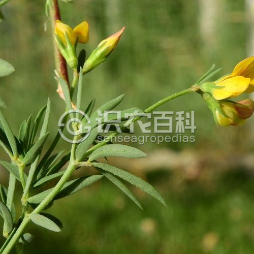 多年生草本,高20-100厘米,無毛或微被疏柔毛。莖細(xì)柔,直立,節(jié)間較長,中空。羽狀復(fù)葉小葉5枚;葉軸長2-3毫米;小葉線形至長圓狀線形,長12-25毫米,寬2-4毫米,短尖頭,大小略不相等,中脈不清浙;小葉柄短,幾無毛。傘形花序;總花梗纖細(xì),長3-8厘米;花1-3 (-5) 朵,頂生,長8-13毫米;苞片1-3枚,葉狀,比萼長1.5-2倍;花梗短;萼鐘形,長5-6毫米,寬3毫米,幾無毛,萼齒狹三角形漸尖,與萼筒等長;花冠黃色帶細(xì)紅脈紋,旗瓣圓形,稍長于翼瓣和龍骨瓣,翼瓣略短;雄蕊兩體,上方離生1枚較短,其余9枚5長4短,分列成二組;花桂直,無毛,直角上指,子房線形,胚珠多數(shù)。莢果直,圓往形,長2-4厘米,徑2毫米;種子球形,徑約1毫米,橄欖綠色,平滑。花期5-8月,果期7-9月。