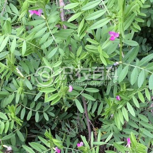 多年生草本,高30-100厘米。 根莖匍匐,莖柔細斜升或攀援,具棱,疏被柔毛。 偶數羽狀復葉長7-12厘米,葉軸頂端卷須發達;托葉半戟形,有2-4裂齒;小葉5-7對,長卵圓形或長圓披針形,長0.6-3厘米,寬0.4-1.3厘米,先端鈍或平截,微凹,有短尖頭,基部圓形,兩面被疏柔毛,下面較密。 短總狀花序,花2-4 (-6) 朵腋生;花萼鐘狀,萼齒披針形或錐形,短于萼筒;花冠紅色或近紫色至淺粉紅色,稀白色;旗瓣近提琴形,先端凹,翼瓣短于旗瓣,龍骨瓣內彎,最短;子房線形,無毛,胚珠5,子房柄短,花柱與子房聯接處呈近90°夾角;柱頭遠軸面有一束黃髯毛。 [1] 莢果寬長圓狀,近菱形,長2.1-3.9厘米,寬0.5-0.7厘米,成熟時亮黑色,先端具喙,微彎。 種子5-7,扁圓球形,表皮棕色有斑,種臍長相當于種子圓周2/3。 花期6月,果期7-8月。