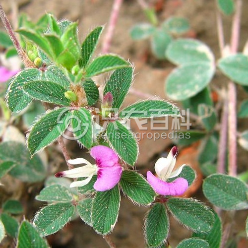 披散或平臥,多分枝,高(5-)10-45厘米,莖和枝上被倒生的白色細(xì)毛。葉為三出羽狀復(fù)葉;托葉大,膜質(zhì),卵狀長(zhǎng)圓形,比葉柄長(zhǎng),長(zhǎng)3-4毫米,具條紋,有緣毛;葉柄極短;小葉紙質(zhì),倒卵形、長(zhǎng)倒卵形或長(zhǎng)圓形,較小,長(zhǎng)6-22毫米,寬3-8毫米,先端圓形,稀微缺,基部近圓形或?qū)捫ㄐ危墸粌擅嫜刂忻}及邊緣有白色粗毛,但上面毛較稀少,側(cè)脈多而密。花小,單生或2-3朵簇生于葉腋;花梗下端具2枚大小不等的苞片,萼基部具4枚小苞片,其中1枚極小,位于花梗關(guān)節(jié)處,小苞片常具5-7條縱脈;花萼鐘狀,帶紫色,5裂,裂片寬卵形,具網(wǎng)狀脈,外面及邊緣具白毛;花冠粉紅色或紫色,長(zhǎng)5-6毫米,較萼約長(zhǎng)1倍,旗瓣橢圓形,下部漸狹成瓣柄,具耳,龍骨瓣比旗瓣稍長(zhǎng)或近等長(zhǎng),翼瓣比龍骨瓣稍短。莢果圓形或倒卵形,稍側(cè)扁,長(zhǎng)3.5-5毫米,較萼稍長(zhǎng)或長(zhǎng)達(dá)1倍,先端短尖,被小柔毛。花期7-9月,果期8-10月。