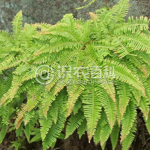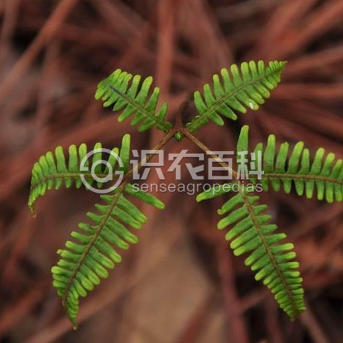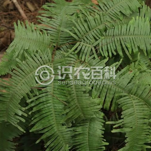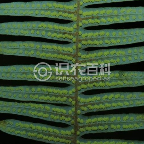 (120)厘米。根狀莖橫走,粗約2毫米,密被暗銹色長毛。葉遠(yuǎn)生,柄長24-56厘米,粗1.5-2毫米,棕禾稈色,光滑,基部以上無毛;葉軸一至二(三)回二叉分枝,一回羽軸長約9厘米,被暗銹色毛,漸變光滑,有時頂芽萌發(fā),生出的一回羽軸,長6.5-17.5厘米,二回羽軸長3-5厘米;腋芽小,卵形,密被銹黃色毛;芽苞長5-7毫米,卵形,邊緣具不規(guī)則裂片或粗牙齒,偶為全緣;各回分叉處兩側(cè)均各有一對托葉狀的羽片,平展,寬披針形,等大或不等,生于一回分叉處的長9.5-16.5厘米,寬3.5-5.2厘米,生于二回分叉處的較小,長4.4-11.5厘米,寬1.6-3.6厘米;末回羽片長16-23.5厘米,寬約4-5.5厘米,披針形或?qū)捙樞?,向頂端變狹,尾狀,基部上側(cè)變狹,篦齒狀深裂幾達(dá)羽軸;裂片平展,35-50對,線狀披針形,長1.5-2.9厘米,寬3-4毫米,頂鈍,常微凹,羽片基部上側(cè)的數(shù)對極短,三角形或三角狀長圓形,長4-10毫米,各裂片基部匯合,有尖狹的缺刻,全緣,具軟骨質(zhì)的狹邊。側(cè)脈兩面隆起,明顯,斜展,每組有3-4(5)條并行小脈,直達(dá)葉緣。 葉為紙質(zhì),上面黃綠色或綠色,沿羽軸被銹色毛,后變無毛,下面灰白色,沿中脈及側(cè)脈疏被銹色毛。孢子囊羣圓形,一列,著生于基部上側(cè)或上下兩側(cè)小脈的彎弓處,由5-8個孢子囊組成。