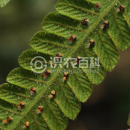 植株高35-50(-60)厘米。根狀莖長而橫走,粗約2毫米,光滑,先端略被披針形鱗片。葉近生;葉柄長15-20(-30)厘米,粗約1.5毫米,禾稈色,多少被短毛或有時光滑;葉片長18-30厘米,寬7-13厘米,披針形或闊披針形,先端漸尖并羽裂,向基部不變狹;二回羽狀深裂;羽片約15對,平展或斜上,互生或下部的近對生,無柄,彼此相距1.5-2.5厘米,長4-7厘米,寬1-1.5厘米,披針形或線狀披針形,先端漸尖,基部對稱,稍變寬,或基部一對向基部略變狹,截形,羽裂幾羽軸;裂片15-20對或更多,開展,彼此接近,長5-6毫米,寬約2毫米,長圓狀披針形,圓鈍頭或為鈍尖頭,全緣,基部一對,尤其上側(cè)一片通常較長。葉脈明顯,側(cè)脈單一,斜上,每裂片5-7對,基部一對出自主脈基部以上。葉草質(zhì),干后草綠色或有時褐綠色羽片下面除密被橙黃色圓球形腺體外,光滑或疏被短毛,上面沿羽軸的縱溝密被針狀毛,沿葉脈偶有少數(shù)短針毛,葉軸多少被灰白色柔毛。孢子囊群小,圓形,每裂片4-5對,背生于側(cè)脈的近頂部,靠近葉邊;囊群蓋中等大,圓腎形,棕色,厚膜質(zhì),背面疏被灰白色剛毛,宿存。孢子兩面型,圓腎形,周壁具褶皺,其上的細網(wǎng)狀紋飾明顯而規(guī)則。